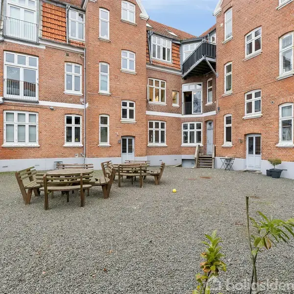 På Nygade midt i Ringkøbing ligger der en flot, klassisk rødstensejendom, som har prydet bybilledet siden 1910. Netop her, nærmere bestemt på første sal, kan I nu erhverve jer denne skønne ejerlejlighed. Der er tale om en toværelses, som er moderniseret i 2023, herunder med nye gulve, nyt køkken og nyt badeværelse. Indenfor byder boligen på en dejlig rumfornemmelse – særligt i den højloftede stue. Stuen er regulær og har indbygget reolsystem, og såvel her som i resten af lejligheden er der kvalitetsgulv fra Timberman. Bemærk tillige de elegante vinduer, der føjer yderligere charme til stuemiljøet. Hjemmets stilrene køkken er udført med lysegrå fronter, som har enkle sorte greb, og samtlige hvidevarer er diskret integreret i designet. Køkkenet har optimale opbevaringsforhold, og som et plus kan det indrettes med en spisekrog. Soveværelset er lyst og luftigt, og det har dobbeltdør ud til en fransk altan. Der er i øvrigt walk-in-closet med moderne akustikpaneler – endnu en smart detalje. Side om side med soveværelset findes det lækre badeværelse, som fremstår med dekorative væg- og gulvfliser. Badeværelset har muret bruseniche og håndklædetørrer med timer, og spejlet har ligeledes varme samt indbygget belysning. Planløsningen afrundes af en fordelingsentré, hvis lille depotrum gemmer på en praktisk vaskesøjle. Boligen er en del af en god og sund ejerforening, hvoraf de fleste i foreningen selv bor i lejlighederne. Alle ejendommens beboere deles om en hyggelig gård, hvor der er opsat havemøbler til fælles brug. Beliggenheden bliver ikke meget mere central, for I bosætter jer for enden af den stemningsfulde gågade – og med biografen lige rundt om hjørnet. Der er hertil kun omkring tre minutters gang til tog- og busstationen, og har I bil, kan I desuden se frem til fine parkeringsmuligheder tæt på hjemmet.