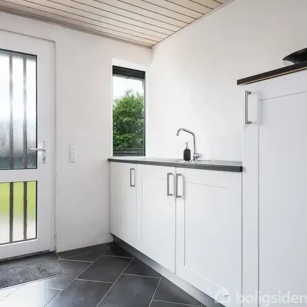 Her får du et rigtig flot hus, der løbende er renoveret og som står yderst velholdt både inde som ude. Der er enkelte mahogni vinduer - resten er pvc vinduer. Taget er et nyrenoveret sort eternittag som evt. fint kan bære et betontegltag, hvis man ønsker at "shine" boligen endnu mere. Boligen er indrettet med bryggers, der også fungerer som entré. Her er fint hvid skabs arrangement med mørkegrå bordplade med vask. Klinkerne på gulvet er sorte og her er gulvvarme. Herfra er der adgang til dejlig