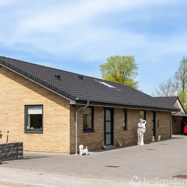 155 m2 luksus fra 2019 med 90 m2 garage Med fin rolig beliggenhed i hyggelige Gadstrup, 7 min. gang fra stationen med kun 40 togminutter fra København H, ligger denne elegante vinkelbyggede villa i ét plan på 155 m2 samt 90 m2 skøn stor muret opvarmet garage – heraf 19 m2 integreret carport. Opført i 2019 i smukke lysebrune mursten med sort tegltag og vedligeholdelsesfri lavenergivinduer med fint lysindfald. Energirigtig luft-til-vand varmepumpe og høj komfort med gulvvarme overalt og ventilat