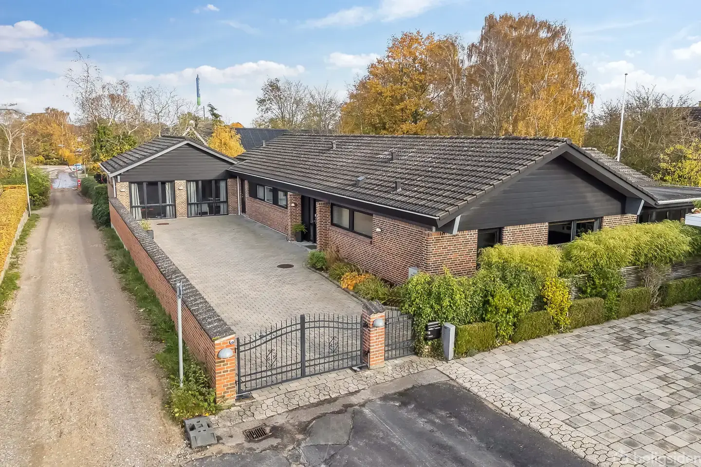 I Slagelse Vestby finder I denne velindrettede etplansvilla på hele 279 m2. Her venter en bolig, der rummer plads til både familieliv og eventuelt liberalt erhverv. Ejendommen ligger for enden af en stille, lukket vej i et roligt kvarter med gode stisystemer, hvilket sikrer både tryghed og bekvemmelighed. Ejendommen fremtræder velholdt og indbydende med et harmonisk udtryk i tegl og mørke trædetaljer. Den store flisebelagte indkørsel giver god plads til parkering. Indenfor mødes I af en funktio