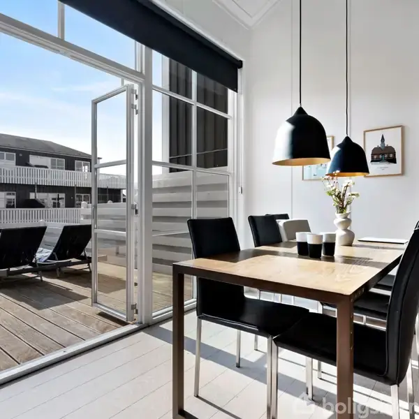 Åbent hus med tilmeldingskrav 5/2 - klik på billede - Lys og moderne ferielejlighed med stor terrasse i Øer Maritime Ferieby I den attraktive Øer Maritime Ferieby, finder du denne skønne og moderne ferielejlighed. Her får du en unik kombination af afslapning, vandmiljø og hyggeligt havneliv – kun få minutter fra charmerende Ebeltoft. Lejligheden fremstår lys, indbydende og velholdt med et stilrent interiør og store vinduespartier, der sikrer et skønt lysindfald hele dagen. Fra spiseområdet er der direkte udgang til en stor og solrig træterrasse med udsigt til vandet og de omkringliggende huse. Her er der god plads til både loungemøbler, spisebord og grill, hvilket gør terrassen perfekt til både afslapning og socialt samvær. Indendørs byder lejligheden på en rummelig spiseafdeling med loft til kip og moderne sort/hvide detaljer. Køkkenet er integreret i det åbne opholdsrum og er udstyret med alle nødvendige faciliteter. Derudover er der et lyst badeværelse med bruseniche samt entre med opbevaringsplads. På første sal finder du et rummeligt soveværelse med kig ned over stuen samt et værelse med dobbeltseng og køjeseng – ideelt til både børn og voksne. Der er desuden en lille repos med plads til skrivebord eller hyggehjørne. Øer Maritime Ferieby er bygget op omkring et charmerende kanalsystem med små broer, der forbinder de syv øer. Området emmer af maritim stemning med farverige huse, både, vand og hyggelige stier. Her er både købmand, reception, sportshal, svømmehal og forskellige udendørs aktiviteter lige ved hånden. Dette er den perfekte base for ferie med familien, par eller venner – med masser af naturoplevelser, sandstrande, cykel- og vandreruter samt fiskemuligheder lige udenfor døren.