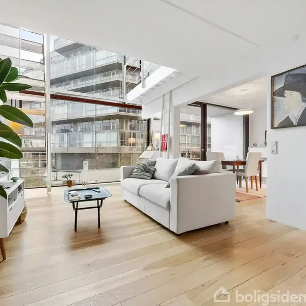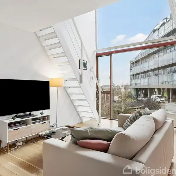Åbent hus med tilmeldingskrav 1/2 - klik på billede - Nu udbydes denne helt særlige og arkitektonisk unikke lejlighed i tre plan, centralt beliggende i Ørestad City i det ikoniske M-hus tegnet af Bjarke Ingels Group (BIG). Boligen byder dig velkommen i et lyst og indbydende køkken-alrum med moderne køkken i hvide elementer og masser af plads. De store vinduespartier sikrer et smukt lysindfald året rundt og en imponerende udsigt. Herfra er der direkte udgang til lejlighedens indbyggede altan. Her er der både god plads til spisebord og et hyggeligt sofaarrangement. Øverste plan rummer en rummelig hems, der i dag anvendes som hobbyrum og kontor, men som nemt kan indrettes til gæste- eller børneværelse. Rummet kan også fungere som stue, hvilket giver mulighed for fleksible og alternative indretninger. På nederste plan finder du et stort soveværelse med et indbygget skab, der næsten fungerer som walk-in-closet. De store gulv-til-loft vinduer sikrer et fantastisk lysindfald og skaber en luftig rumfornemmelse. Rummet kan også anvendes som opholdsstue efter behov. Badeværelset er stilfuldt indrettet med separat bruseniche, væghængt toilet, gulvvarme og god skabsplads. Der er desuden en praktisk vaskesøjle med vaskemaskine og tørretumbler. Dertil ligger lejligheden attraktivt placeret, tæt på metro og hverdagens fornødenheder. På en kort gåtur har man byparken og har man behov for mere natur, så kan man fortsætte videre ud på fælleden. Når du køber en bolig gennem EDC, har du mulighed for at få en gratis flytteforsikring. Ønsker du denne, skal du sende en mail med "Ja tak" til [email protected]