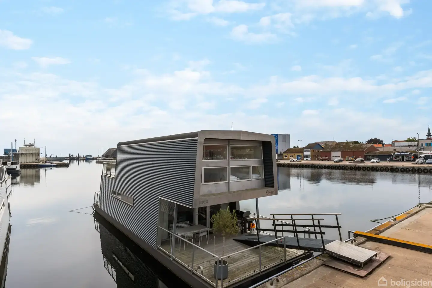 Moderne husbåd på Nexø Kaj med tre terrasser