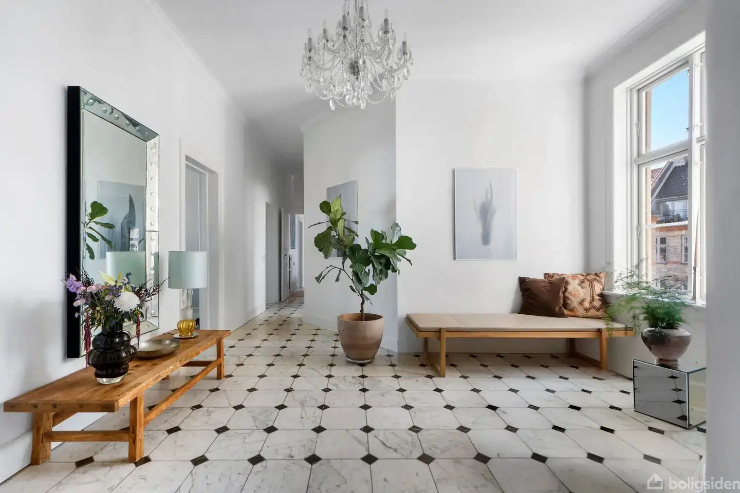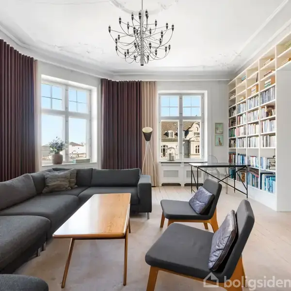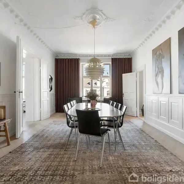 Hjørnelejligheder kan, ikke overraskende, se om hjørner. Men når man er hjørneejendom til Sankt Jakobs Plads, ja, så er det ok at skutte sig lidt, som man nu gør, når man sidder på bagsædet af en bil, hvor de kendte og populære i byen sidder bag rattet. Sankt Jakobs Plads er godt nok bare en musebid af Paris, ja, med franske Michelinkok Daniel Letz på Le Saint Jacques, med salg af gode vine og dristige oste fra den gamle tankstation og caféstemningen og de gode restauranter. Her er økologisk marked alle lørdage, og her får man sig en sludder med tjenerne, der pakker stolene ud for at begynde dagen, her går kokkene over pladsen i deres hvide kokketøj og henter varer på den fine tankstation. Sol hele dagen Med masser af himmellys ligger lejligheden på Østerbrogade 106 på 4. sal højt hævet over byens summen. Med Sankt Jakobs Kirke til højre og ingen høje bygninger overfor er der et guddommeligt himmelkig og en fri udsigt over Østerbros tage. Det er en lejlighed med masser af lys. Det er en lejlighed med altan, hvor solen skinner fra tidlig formiddag til sen eftermiddag. Og som noget helt særligt er der et ekstra værelse, et kollegieværelse eller en lillebitte lejlighed måske på etagen oven over, som kan udlejes. Med 243 m2 plus 31 m2 og masser af værelser er her masser af plads med en god planløsning. Lejligheden er født til festivitas, mange gæster og store familier. Ejendommen er fra 1902. Evigt liv Søerne begynder på Østerbrogade. De er der på guldalderens malerier, i den tidlige litteratur og historiebøgerne. Og de vil være der altid, for med fredningen i 1966 fik de 3 søer i København et løfte om evigt liv. Børn og voksne giver ænder og svaner mad. Der bliver kysset på bænke og holdt i hånden. Og selv om promenaderne er tænkt til borgere, der flanerer turen rundt om søerne, så er her også plads til motionister, termokander og caféer.