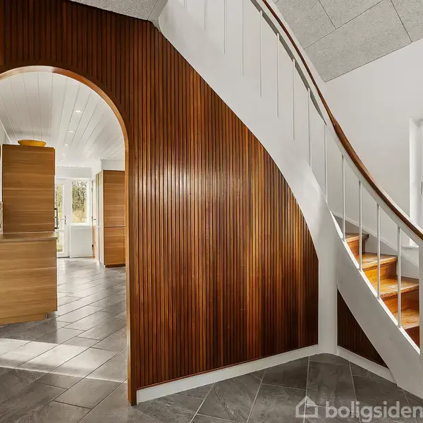 Velkommen til denne rummelige villa med en grund på 889 m² placeret i rolige omgivelser tæt på Holme Å og Østerbygård dambrug. Boligen, der rummer 153 m² bolig og 91m² kælder, henvender sig særligt til førstegangskøbere og unge par, der ønsker et hjem med plads til både fællesskab og privatliv midt i naturen. Facaden i klassisk rødt murværk vidner om husets solide byggeri, mens de store vinduer sikrer et naturligt lysindfald. Fra entréen er der direkte adgang til hjemmets centrale opholdsrum. In