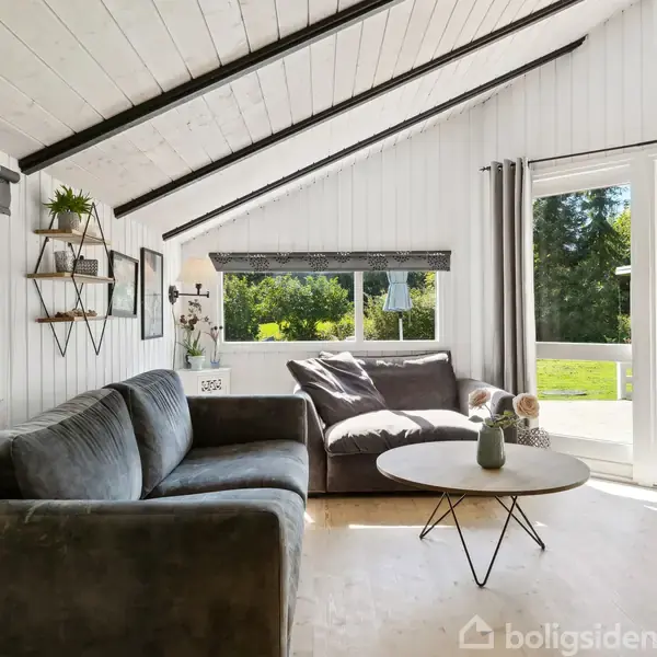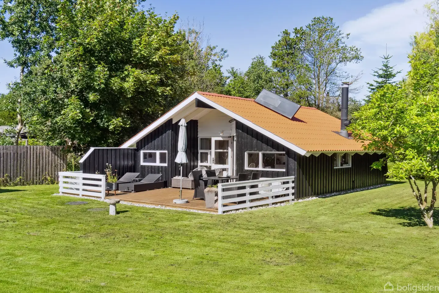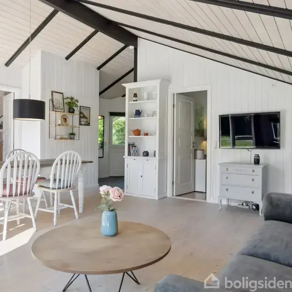 Dette hyggelige og løbende moderniserede sommerhus ligger i et roligt område for enden af en blind vej – kun 425 meter fra stranden med badebro i sommermånederne. Den store, ugenerede grund giver masser af plads til leg, boldspil og afslapning, og i gåafstand finder I både en fantastisk legeplads med mange faciliteter og en restaurant. Hjertet i huset er det lyse fællesrum med loft til kip og køkken, spiseplads og stue i ét. Herfra er der direkte udgang til haven og terrassen, hvor både lounge