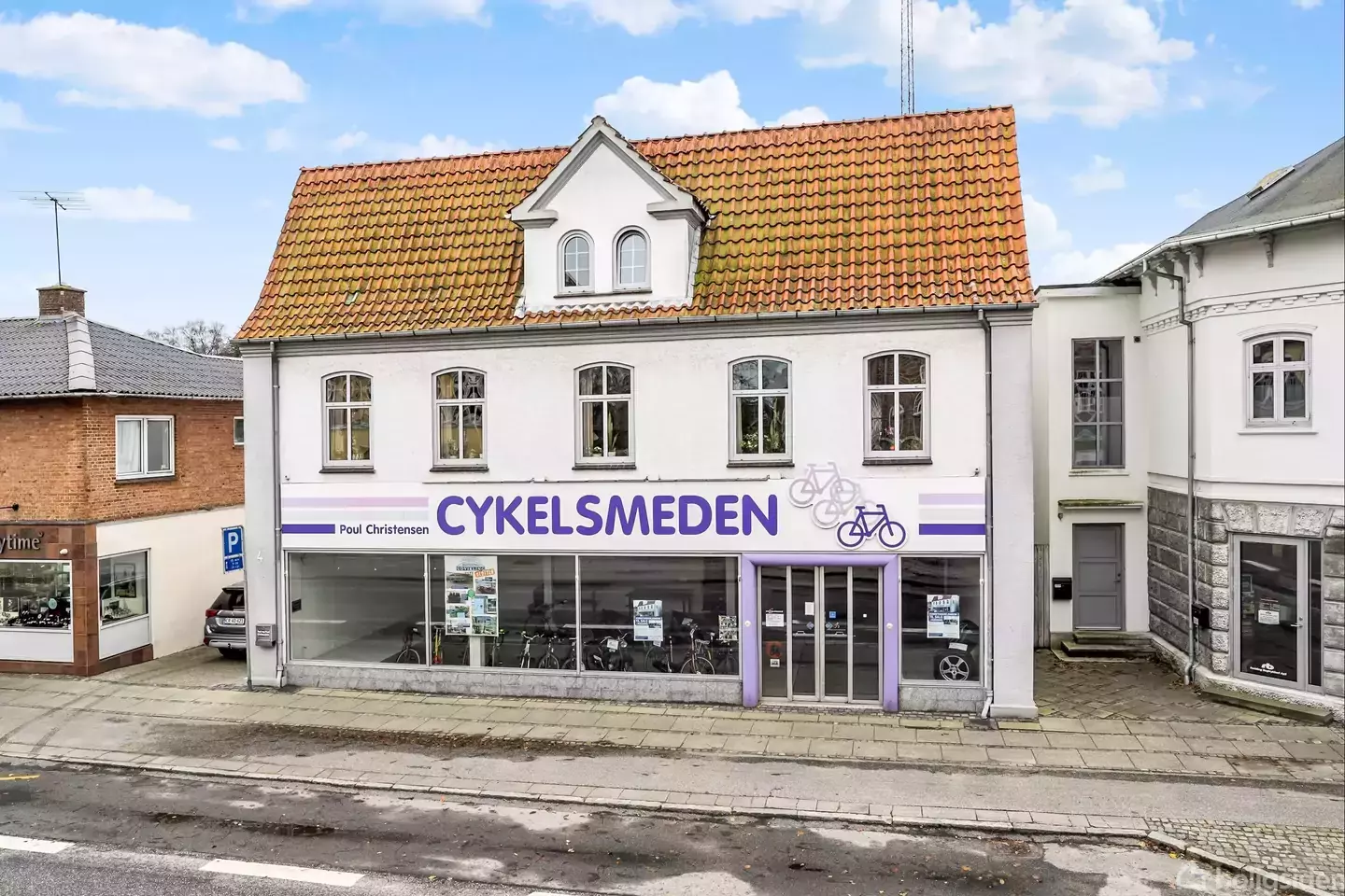 Åbent hus med tilmeldingskrav 14/3 - klik på billede - Går I og leger med idéen om at åbne jeres eget værksted? Eller er det begyndt at knibe med pladsen, der hvor I har hjemme? Så melder muligheden sig nu for at rykke ind i cykelsmedens lokaler. Bygningen består i stueetagen af en fin butik og et stort værksted med udluftning, varmepumper og et slidstærkt gulv. Tager I trappen ovenpå, har I jeres privatbolig, der strækker sig over to etager. Her er der sildebensparket i den ene af husets to stuer, smukke originale døre og karme fra 1898, knap tre meter til loftet og intet mindre end fem gode værelser udover soveværelset. Inden for de sidste ti år har de fleste af ejendommens bygninger fået lagt nyt tag, ligesom de alle har fået en tur med penslen. I 2021 blev der også lagt en ny sydvendt træterrasse, på hvad man kan kalde husets tagterrasse. Her er I garanteret sol dagen lang, når vejrguderne tillader det, og når det alligevel bliver for varmt heroppe, kan I søge ly under halvtaget med vindrueranker eller i annekset i den anden ende af terrassen. Der er monteret solceller, der forsyner boligdelen med strøm. Værkstedet ligger centralt i hyggelige Rødding, side om side med byens blomsterbutikker, optikere og sportsbutikker, så det bliver intet problem for kunderne at finde vej til butikken. Børnene får også kort skolevej til Rødding Skole lidt længere nede ad vejen, ligesom friskolen og børnehaven ligger lige i nærheden. Og så kan I tilbringe lørdagen i Røddingcentret, i svømmehallen eller på biblioteket. Ejendommen er beliggende i centrum af Rødding, hvor der er et godt udvalg af forretninger. Ring for yderligere oplysninger