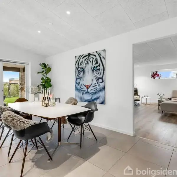 Så er det nu, du skal slå til, hvis du er på jagt efter en indflytningsklar villa beliggende i et attraktivt og meget børnevenligt kvarter i Lind. Villaer her er opført i 2022 af Milton Huse, og i forbindelse med opførelsen er der lavet en masse lækre tilvalg og opgraderinger af nuværende ejer, så man i dag har en super funktionel, veludnyttet og virkelig gennemført bolig. Området er meget børnevenligt med lukkede stikveje, stisystemer og meget tæt på den nye daginstitution "Kastanjegården", Lind skole og hallen. Det hele ligger i gåafstand fra denne villa. Beliggenheden er fantastisk på den skønneste sydvendte grund grænsende direkte op til stien, så man har luft og lys over til naboen. Villaen er bygget med en stor overdækket terrasse, hvor de lune sommeraftener rigtig kan nydes, hvor der virkelig er plads til at samle familie og venner i haven og på terrassen. Til villaen hører også en dobbelt carport med tilhørende redskabsrum, og skulle man komme til at mangle lidt ekstra opbevaringsplads, så er der over carporten det fineste loftsrum med gulv. Indvendigt går de gennemførte detaljer hånd i hånd med en gennemført høj kvalitet og flotte løsninger overalt. I alrummet er lofterne ført til kip med indbyggede spots. Der gemmer sig et praktisk viktualierum bag en af køkkenlågerne, og så er de elegante sorte armaturer gennemgående. Hvor det er muligt, har man også valgt integrerede skabsløsninger som går helt til loft. INDRETNING: Villaens hjerte er uden tvivl det skønne køkken/alrum, hvor det elegante hvide køkken komplementerer de flotte grå gulvklinker og den dejlige loftshøjde på fornemmeste vis. Her er der plads til hele familien, og samtidig er der udgang gennem det store vinduesparti til haven og den overdækkede terrasse direkte mod syd og vest. Den hyggelige stue har en dejlig størrelse, hvor familie og venner samles i de bløde møbler om en god film i TV. Stuens størrelse indbyder også til et roligt læsehjørne eller måske en ekstra lille legekrog for familiens yngste. Indretningen i villaen er super optimeret med et minimum af spildplads og en indretning, der tilbyder en afdeling i den ene ende af villaen med tre værelser og et gæste-/børnebadeværelse samt lækker forældreafdeling med et skønt soveværelse med stort skydeskabsarrangement og direkte indgang til et dejlig stort badeværelse med bruseniche og flot håndvaskearrangement. I villaen finder du naturligvis også et praktisk bryggers med vask og et stort skydeskabsarrangement med plads til vaskemaskine og tørretumbler. Hvis du drømmer om at bygge eller bo i et nyt hus, men gerne vil springe den lange proces over, så er det her villaen for dig. Bygget i 2022, super velholdt og lige til at flytte ind i. Ring til os allerede i dag, vi er klar til at fremvise ejendomme.