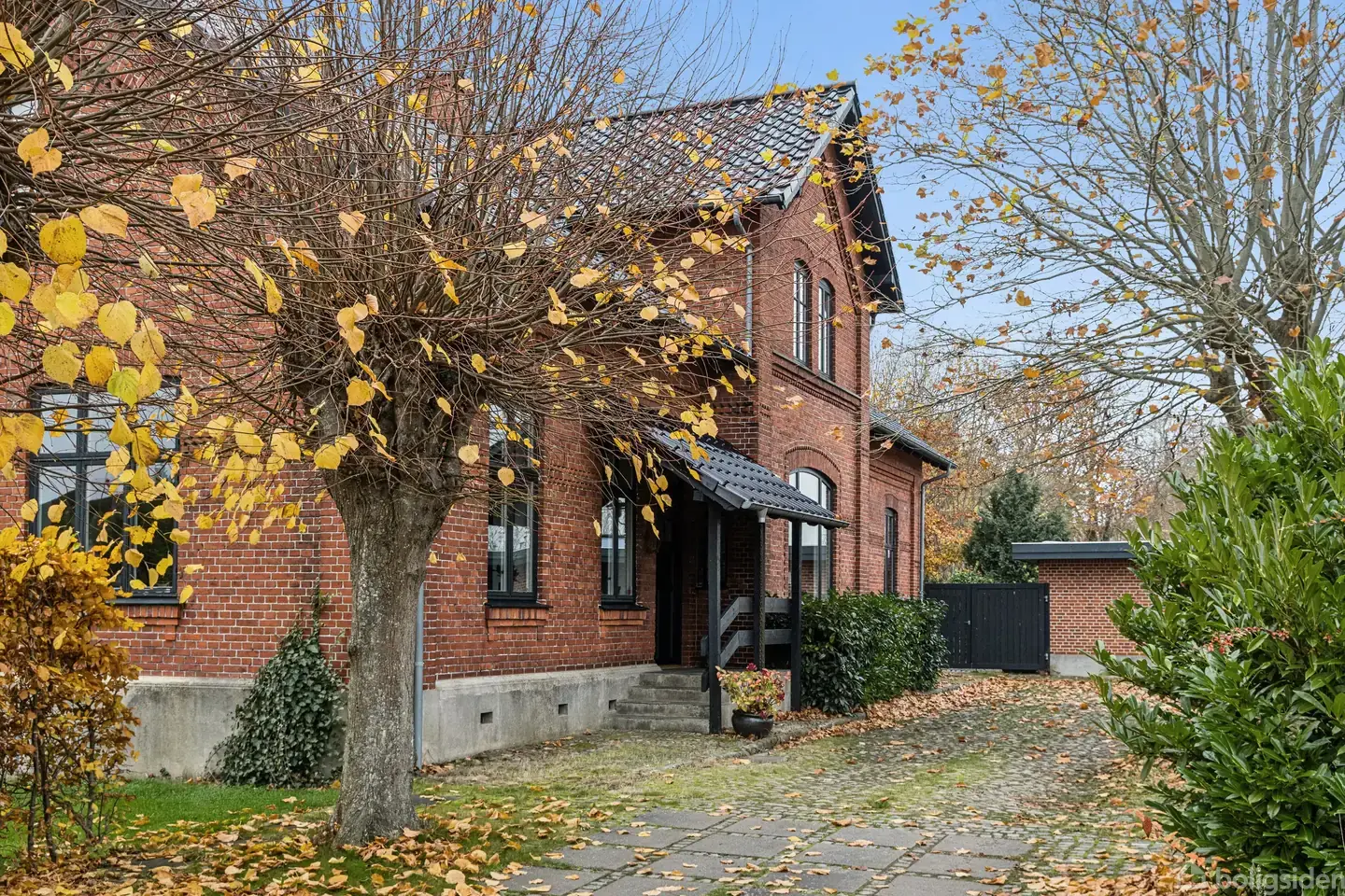 En herskabelig villa for enden af en allé med lindetræer. Det lyder som en drøm fra landet, men det er ikke desto mindre en villa midt i Odder, som har denne utrolige charme. Ikke nok med den fortryllende atmosfære, så er huset også særdeles rummeligt med blandt andet flere stuer og tre badeværelser fordelt mellem to etager.I ankommer til en klassisk gårdsplads med garagen, og huset troner med sin frontispice, detaljerne i murværket, det sorte tag og de buede sprossevinduer. Fordøren og terrasse