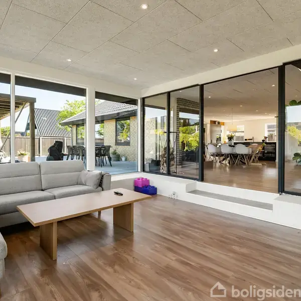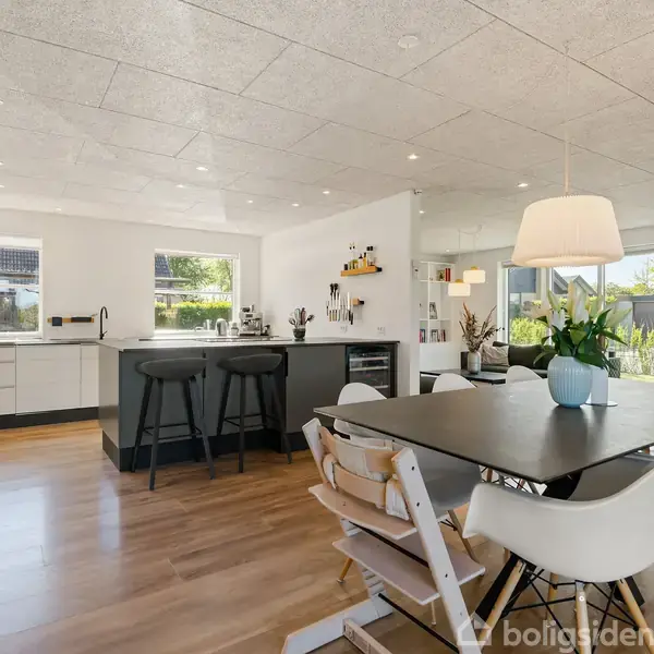 Villaens centrale samlingspunkt er det store, åbne køkken/alrum, som blev totalrenoveret i 2022 med moderne materialer og smagfulde løsninger. Her får familien optimale rammer til madlavning og samvær, og med gulvvarme under gulvet er komforten i top. Køkkenet ligger i åben forbindelse med både spiseområde og stue, hvilket skaber et naturligt flow gennem hjemmet.Udendørsarealet er et stort aktiv: en solrig, vestvendt have giver masser af lys og luft, og den overdækkede terrasse inviterer til ude