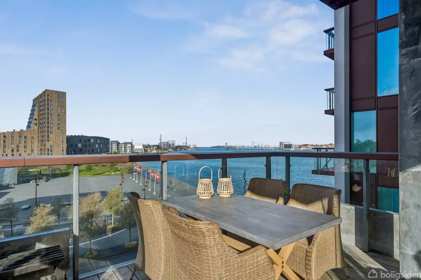 ET HJEM MED HØJ KOMFORT OG FJORDUDSIGT En velholdt og stilren lejlighed med plads Opvarmet, overdækket og solfyldt altan Udsigt til Limfjorden og Musikkens Hus Gode naboer og villavejsstemning Få hjemme lige midt på Havnefronten Vi er nu så heldige at udbyde en lejlighed, der gør livet til en ren fornøjelse. Hjemmets 157 kvadratmeter strækker sig over en åben planløsning, der indbyder til såvel afslapning som festlige selskaber, og komforten er selvfølgelig i top. En særlig gevinst er udsigten