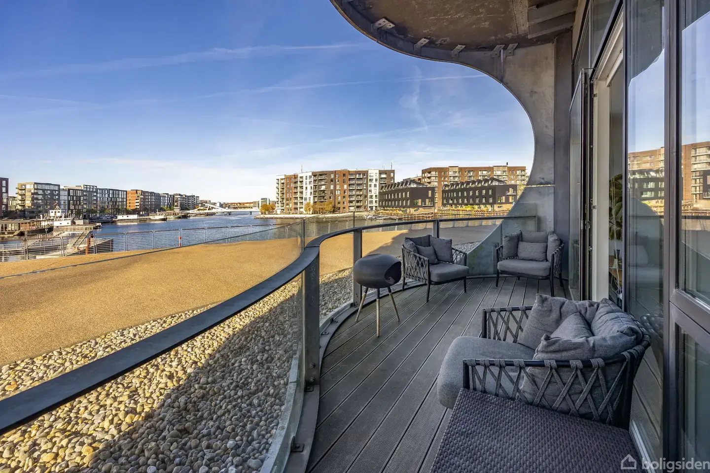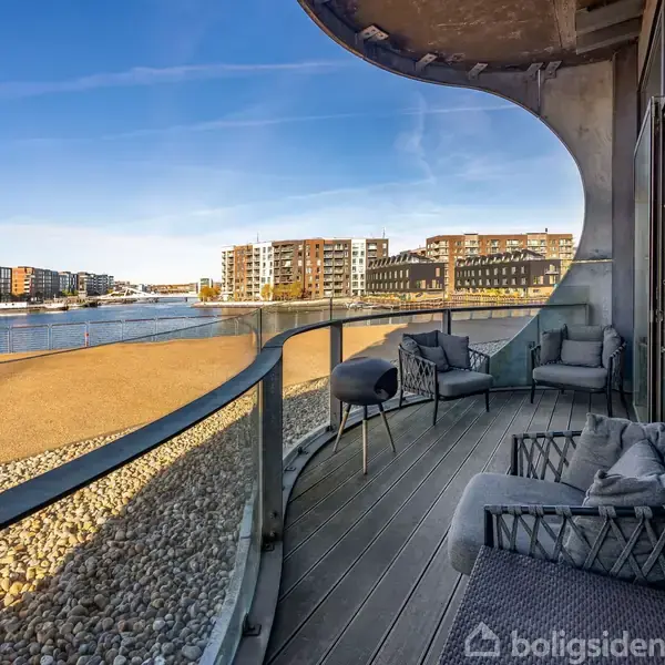 Med adresse på Sluseholmens mest markante punkt ligger den arkitektoniske ikonbygning Metropolis som en ø i byen, omgivet af vand til alle sider. Ejendommen rejser sig omkring 40 meter over havneløbet og er resultatet af et internationalt samarbejde mellem Kasper Danielsen Arkitekter og britiske Future Systems. Huset stod færdigt i 2008, rummer 11 etager og byder blandt andet på fælles tagterrasse med panorama, underjordisk parkering og adgang til egen marina. Den organiske formgivning fortsætter indendørs, hvor linjer og kurver spejler vandets bevægelse omkring bygningen. Nærmiljøet gør hverdagen enkel. Skole, daginstitutioner og indkøb findes i gåafstand, og både bus, havnebus og Sydhavn Station giver let adgang til resten af byen. Den nye metroforbindelse i området gør transport endnu mere smidig. På varme dage ligger Sydhavns havnebad få skridt fra hjemmet, så en dukkert kan blive en del af dagens rytme. Lejligheden er en sjældent udbudt høj stuelejlighed på 106 m², hævet over terræn og uden direkte kontakt til gadeplan – man har derfor ikke den almindelige københavneroplevelse af at bo i stueplan. Tværtimod giver niveauet den optimale højde til at fange den direkte vandudsigt fra stort set alle positioner i boligen. Boligen har altaner på begge sider og et imponerende kig langs kanalen. Indretningen er moderne og velfungerende med to gode soveværelser, to anvendelige hemse, et velproportioneret badeværelse samt et stort opholdsrum, hvor entré, køkken og stue flyder naturligt sammen. Køkkenet fremstår stilrent med lækre materialer, mens de store vinduespartier fra gulv til loft trækker udsigt og dagslys helt ind i boligen via den ca. 3,5 meter høje loftshøjde og lader de smukke trægulve komme til deres ret. Når behovet er ude, fortsætter udelivet på den store fælles tagterrasse, hvor København, Amager Fælled og Teglværkshavnen folder sig ud i horisonten. I kælderen findes eget depotrum, og der er mulighed for at tilkøbe privat parkeringsplads samt bådplads i marinaen. En bolig i Metropolis på dette niveau kombinerer udsigt, arkitektur og bekvemmelighed i en klasse for sig og hører til blandt områdets mest eftertragtede liebhaverhjem.