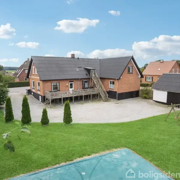Praktisk talt intet er helt normalt ved denne omfangsrige ejendom i Ramten. I de sidste mange år har byens tidligere hotel fungeret som udlejningsejendom, og med hele 302 reelle boligkvadratmeter er der god plads – også til de helt store selskaber. Inden døre byder ejendommen blandt andet på et lækkert poolområde, og der er mulighed for en meget fornuftig udlejning. Det er ovenikøbet et meget nydeligt byggeri fra 1913, der venter i den lille landsbykerne. De røde murstensfacader er diskret udsm