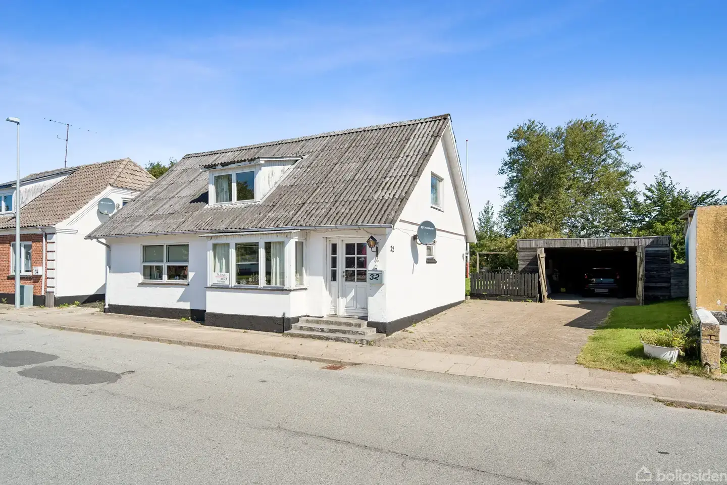 Med få meter til byens dagligvareforretning, finder du dette fine hus. Huset er indrettet i 1 ½ plan og har en lille fin have og stor dobbelt carport på 34 kvm. Huset er kalket og der er nyere vinduer i det meste af huset fra 2018 og 2023. I stueplan er der entre, god lys stue m. karnap, soveværelse med direkte adgang til badeværelse med bruser, spisekøkken og teknikrum, samt baggang med trappe til 1. sal hvor der er 3 værelser. En billig bolig i en god by med stor skole og indkøbsmuligheder li