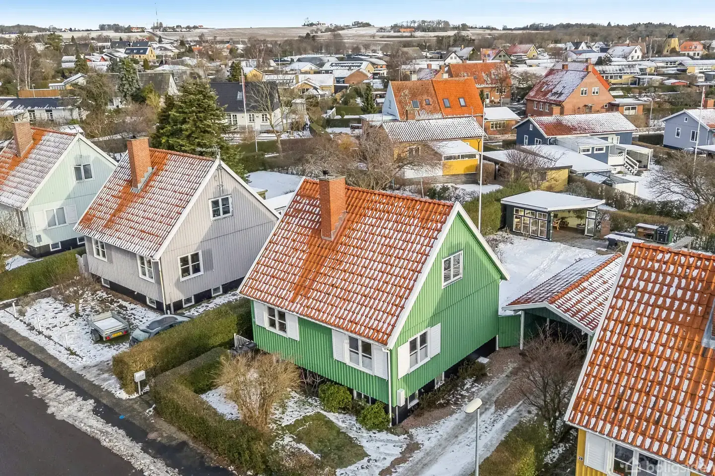Glæd dig til at se denne charmerende og velholdte villa, som er et klassisk svensk træhus med masser af stemningsfuld atmosfære. Huset præsenterer sig flot i grøn med rødt sadeltag, og undertaget er udskiftet i 2024. Omkring det er der anlagt en hyggelig have, som er helt i tråd med byggestilen. Der medfølger en carport og et skur, samt et udhus på terrassen, udemiljøerne i den lukkede have fuldender herligheden. I boligen venter tre fulde etager med gode, brugbare kvadratmeter, smukke detalj