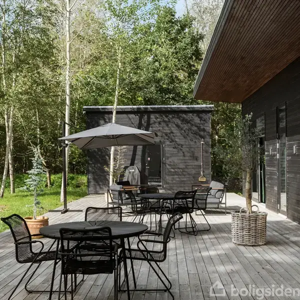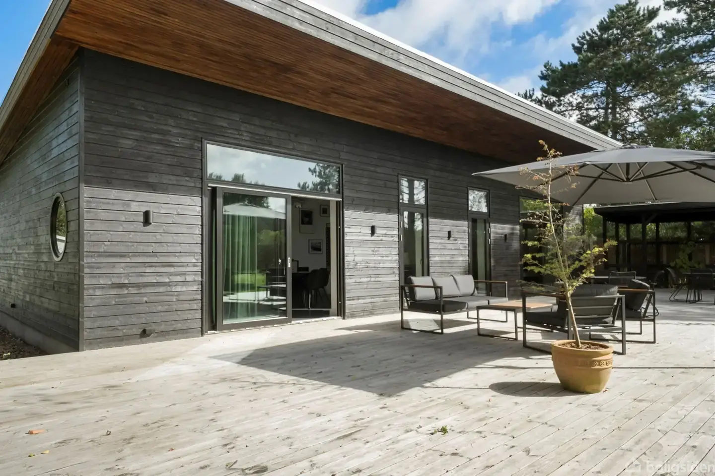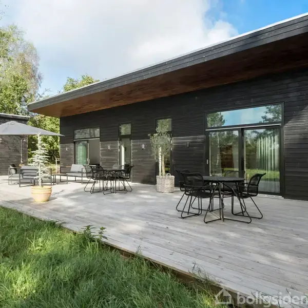 Afslapning og nordisk atmosfære – Nyopført sommerhus På en fredelig stikvej i det populære Ellinge Lyng venter dette nyopførte sommerhus fra 2025 – et hus, der forener moderne komfort, skandinavisk design og nærhed til naturen. Udtrykket er stilrent og nutidigt med sort træbeklædning, ensidig taghældning og store, energirigtige glaspartier, der lader lys og natur strømme ind i boligen. De markante udhæng giver huset karakter og skaber naturlig overdækning omkring bygningen – perfekt til det omskiftelige danske vejr. Den sydvendte terrasse fungerer som et ekstra opholdsrum med flere områder til både afslapning og spisning. Her finder du en overdækket lounge/pavillon og en stemningsfuld udendørs bruser i kobber – ideel efter en frisk dukkert ved stranden. Grunden er anlagt i et let, naturligt udtryk med pileflet hegn omkring grunden, mens den rummelige indkørsel sikrer nem adgang og parkering. Indenfor mødes du af et stort, indbydende køkken/alrum, hvor materialer og farver er nøje afstemt. De mørke fronter står smukt til de integrerede hvidevarer og den elegante kogeplade med bordemhætte, som giver et frit udsyn og et roligt visuelt udtryk. Den generøse loftshøjde og de diskrete spots skaber en behagelig og harmonisk atmosfære – ideel til både madlavning, samvær og lange middage med terrassedørene åbne. Planløsningen er gennemtænkt med tre rummelige soveværelser i hovedhuset, hvoraf det ene har direkte udgang til terrassen. Derudover byder boligen på to stilrene badeværelser med mørke marmoroverflader og messingarmaturer samt et praktisk bryggers med vask og rigelig skabsplads. Det selvstændige udhus er opført i samme æstetik som hovedhuset og rummer hems og eget toilet. Her er perfekte rammer til gæster, atelier eller hjemmekontor – alt efter behov. Teknisk er huset topmoderne med vand båren gulvvarme i alle rum og individuel styring for optimal komfort året rundt. Udvalgte detaljer: · PU-gulve med eksklusivt designerlook gennem hele huset · Gulv-til-loft glaspartier med messingrammer · Lys dæmpere · Solglas i alle døre mod haven, der reducerer direkte solindfald · Veksler til varmt vand i udendørsbruser · Messingdetaljer i greb, armaturer og selv omkring toiletskyl Beliggenheden fuldender oplevelsen. Her får du ægte feriestemning med kort gåafstand til Sejerø Bugts klare vand og hvide sandstrande, og cykelafstand til Ellinge Skov. Samtidig er der nem adgang til indkøb, spisesteder og aktiviteter – så både ferie liv og hverdagslogistik går op i en højere enhed.