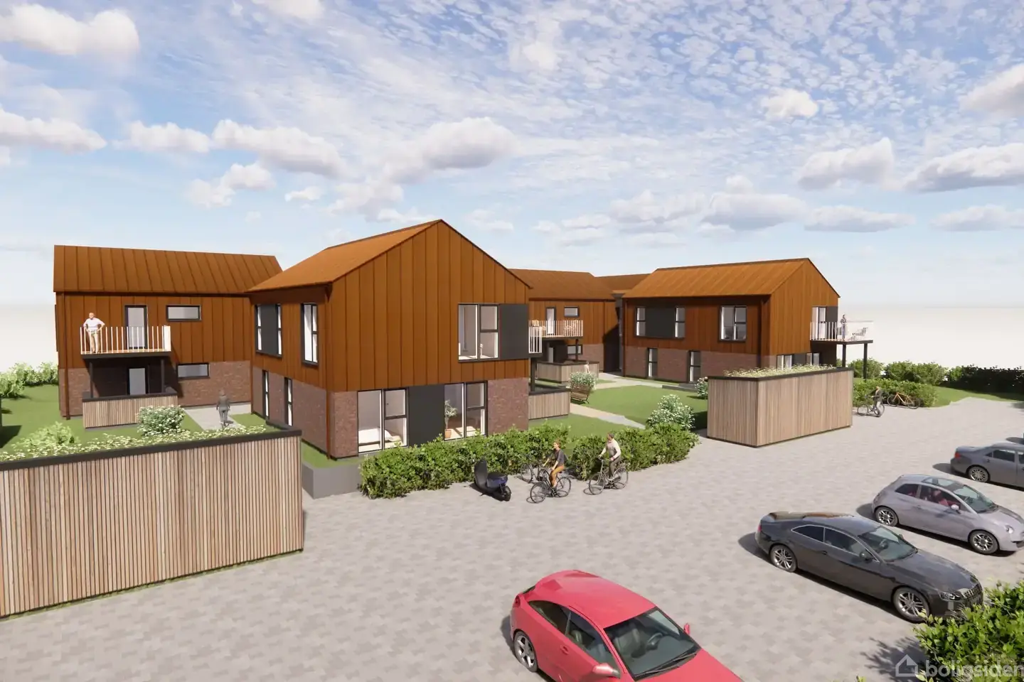 Se mere på Parkvej Give På Parkvej i Give opføres i øjeblikket et nyt og indbydende lejlighedsprojekt, som kommer til at rumme i alt 12 lejligheder fordelt på to bygninger. Hver bygning indeholder seks lejligheder – tre i stueplan og tre på første sal – og ligger i et roligt område med stisystemer og grønne omgivelser, blot en kort gåtur fra Give bymidte. Lejlighederne varierer i størrelse fra ca. 95 til 108 kvadratmeter og udbydes som både tre- og fireværelses boliger, hvilket gør dem velegnede til både par, børnefamilier og andre, der ønsker en moderne bolig med god plads og funktionel indretning, og hvor der er optimale lysforhold fra tre verdenshjørner. Altaner er ca. 8 m² og terrasser er ca. 15 m². Byggeriet udføres i kvalitetsmaterialer med et tydeligt fokus på både æstetik og funktionalitet. De grønne tage med sedum samt de rød/brune ståltage understreger det bæredygtige fokus, mens træbeklædte facader og troldtektlofter bidrager til et naturligt og harmonisk udtryk – både ude og inde. Der etableres parkeringspladser, som passer godt ind i området, og hver lejlighed får tilknyttet sit eget depotrum eller skur på ca. 3,5 m². Begge bygninger forsynes med elevator/lift, hvilket giver nem adgang til lejlighederne på første sal og gør projektet tilgængeligt for alle. Herudover kan bl.a. nævnes, at der er gulvvarme i alle rum, dørtelefon, fjernvarme og ventilationsanlæg. Udvendig vedligeholdelse, herunder også vinduesvask (dog ikke ved altaner/terrasser), varetages af udlejer, og de grønne fællesarealer passes ligeledes af udlejer. Snerydning foretages af udlejer på p-plads og gangstier. Affaldshåndteringen sker via en nedgravet miljøstation, som både er praktisk og diskret integreret i området. Der etableres ladestandere på den fælles p-plads, der kan benyttes af områdets beboere. Der kan søges om tilladelse til at medbringe en hund/kat, dog skal dette godkendes af udlejer i hvert enkelt tilfælde. Projektet på Parkvej henvender sig til dem, der ønsker moderne og vedligeholdelseslette boliger i naturskønne omgivelser, uden at give afkald på nærheden til byens faciliteter. Materialebeskrivelse - Inventar køkken og bad: TVIS. - Hvidevarer: GRAM - Gulve: Mærke: Ter Hürne, Catania Oak (LVT vinyl gulv) - Klinker i bad: 60x60. Mærke: Stem in Taupe - Lofter: Troldtekt, hvid - Gulvvarme i alle rum - Eget skur til hver lejlighed ca. 3,5 m² - Dørtelefon - Eget ventilationsanlæg - Vand og fjernvarme er på lejlighedsniveau. Altså direkte afregning til værket - Tag: Bl.a. Sedum på flade tage. - Facader: Sten, stålplader og træ. - Internet: Fibernet Lejevilkår Depositum: 3 mdr. husleje. Der betales 1/3 ved underskrift af lejekontrakt, og 2/3 betales 01.04.2026. Arealer TYPE A: 3-værelses lejligheder på 95,8 m² TYPE B: 3-værelses lejligheder på 96,3 m² TYPE C: 3 el. 4-værelses lejligheder på 108,7 m² Det bemærkes: - tegninger ej målfaste - der er tale om illustrationer af projektet - arealer er anslået - alle arealer er opgjort som bruttoarealer - ret til ændringer forbeholdes