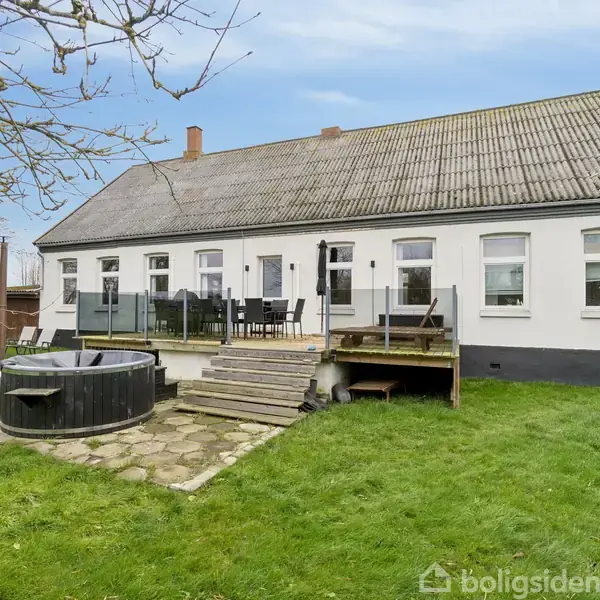 Rummelig og flot landejendom fra 1905 med 6 værelser, terrasse og carport på solrig grund i BodilskerEjendommen kombinerer landlig idyl med masser af plads og fleksibilitet, rummelige rum og gode lysforhold, hvor både husets karakter og funktionalitet kommer til sin ret. Ejendommen rummer et væld af muligheder – hvad enten I drømmer om en flexbolig, et hjem til den store familie eller måske et sted, hvor flere generationer kan bo sammen.Ved ankomsten bydes I velkommen af den klassiske hvide faca