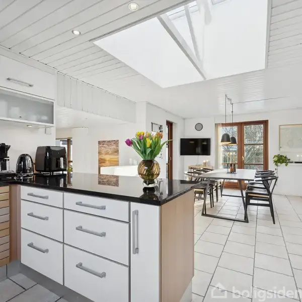 Mere end bare kvadratmeter – et hjem med sjæl og rum til livetDenne indbydende bolig byder på en helt særlig kombination af rummelighed, varme og funktionalitet, hvor hjemmets opholdsrum naturligt bliver samlingspunktet i hverdagen. Det store alrum og køkken smelter smukt sammen og åbner op mod stuen, hvor lyset strømmer ind gennem de brede vinduespartier og skaber en rolig, behagelig atmosfære. Her er plads til lange middage, afslappede stunder og samvær på tværs af generationer.Stuen ligger le