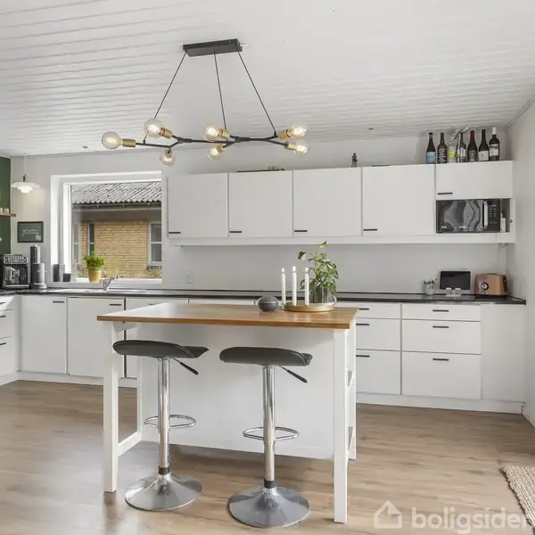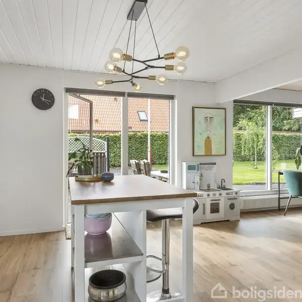 Velkommen til en lys og rummelig bolig med store sammenhængende opholdsrum og et skønt kig til den grønne have. Huset ligger for enden af en rolig stikvej med gode stisystemer og let adgang til by, skole og motorvej. Her får familien masser af plads – både inde og ude – og mulighed for at forme hjemmet efter egne ønsker.Via entréen ledes du ind i et stort køkken/alrum i åben forbindelse med stuen. De brede vinduespartier giver et dejligt lysindfald mod haven, og de store terrassedøre binder inde
