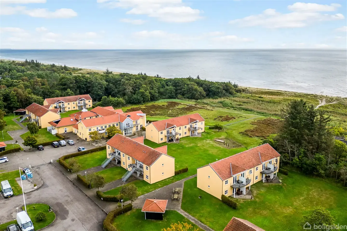 Åbent hus med tilmeldingskrav 4/2 - klik på billede - LÆKKER FERIELEJLIGHED VED VANDET - altan og gode fællesarealer Lækker lille ferielejlighed, hvor alt er lyst og ligetil – og hvor fællesarealerne udgør en fantastisk legeplads, hvis man holder ferie med børn – og terrassen en solrig (og yderst vedligeholdelsesnem) retræte, hvor man kan tage den med ro. Lejlighed er godt indrettet; kvadratmeterne fordeler sig på en god lille entré, og et veludstyret og velindrettet køkkenalrum og en dejlig stue med udgang til altan, lyst badeværelse og to fine værelser. Tidssvarende og nem at overtage. Fra altanen er der naturskøn udsigt, og så er der både skov og strand i absolut allernærmeste nabolag og kort afstand til byens liv, restauranter, indkøbsmuligheder og kulturliv. En velholdt og sund feriebolig, der også sagtens kan holde til udlejning, så I kan medfinansiere egne ferier. Lejligheden er nem at bruge året rundt – og kræver et absolut minimum af vedligehold. Hyggeligt liv på fællesarealerne, hvor feriebørn leger på kryds og tværs. Overdækket terrasse i forbindelse med indgang til lejligheden.
