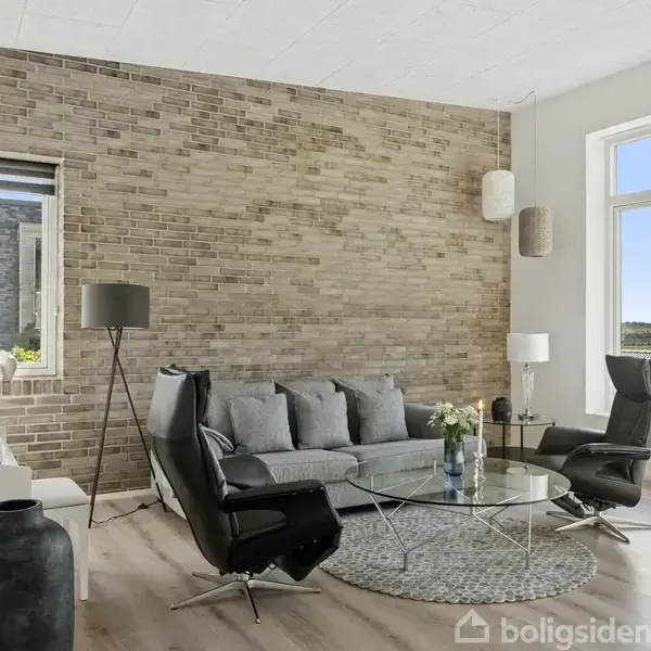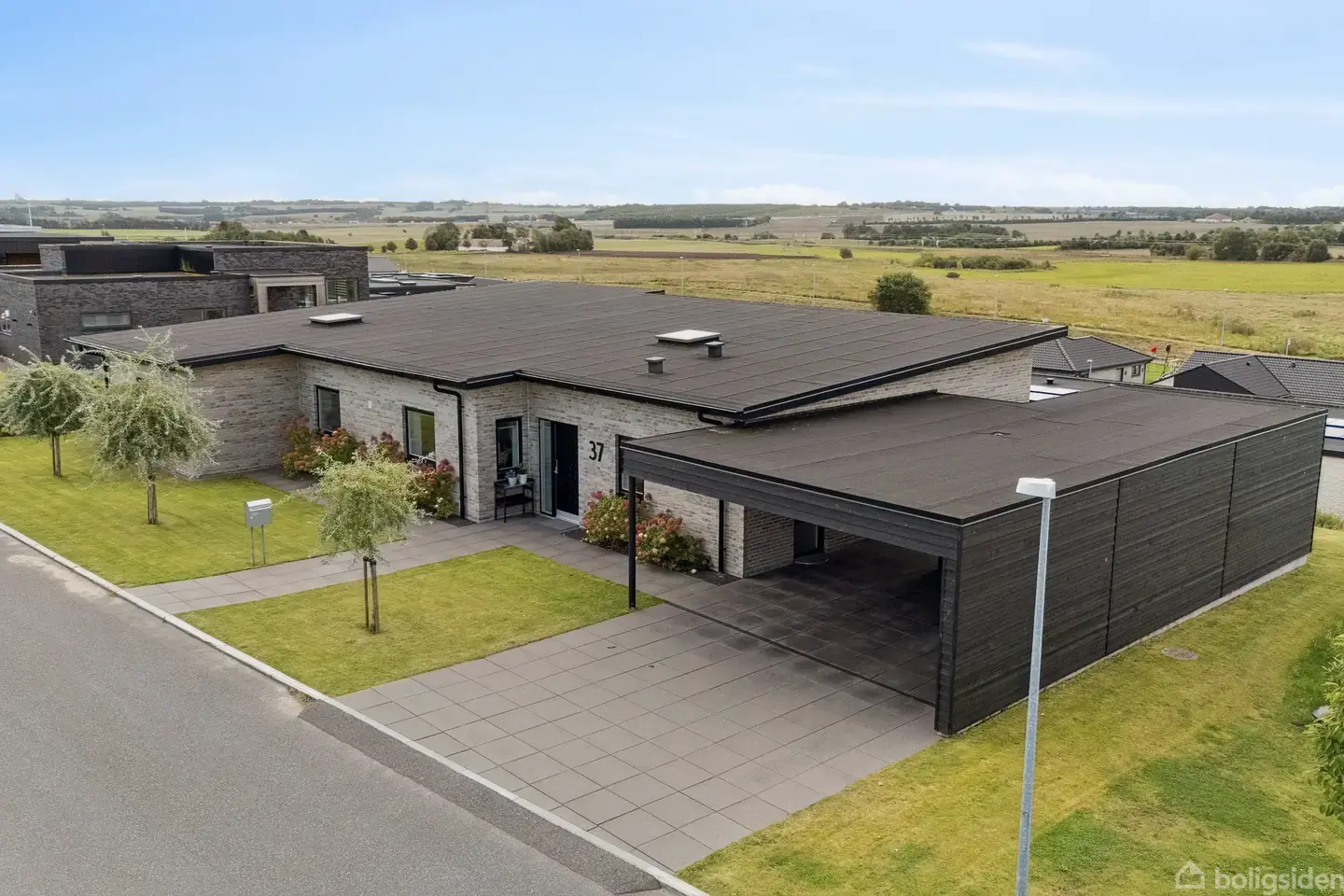 Moderne udsigtsvilla med panoramaudsigt – Præstegårdsvej 37 På Præstegårdsvej ligger denne fuldmurede villa fra 2018 – en bolig, hvor arkitektur, funktionalitet og natur går op i en højere enhed. Husets hjerte er det store køkken-alrum med køkken-ø og masser af plads til både hverdag og gæster. Herfra er der åben forbindelse til opholdsstuen i forskudt niveau, hvor et imponerende vinduesparti bringer udsigten helt tæt på. Her kan du nyde årstidernes skiften og et levende landskab hver eneste d