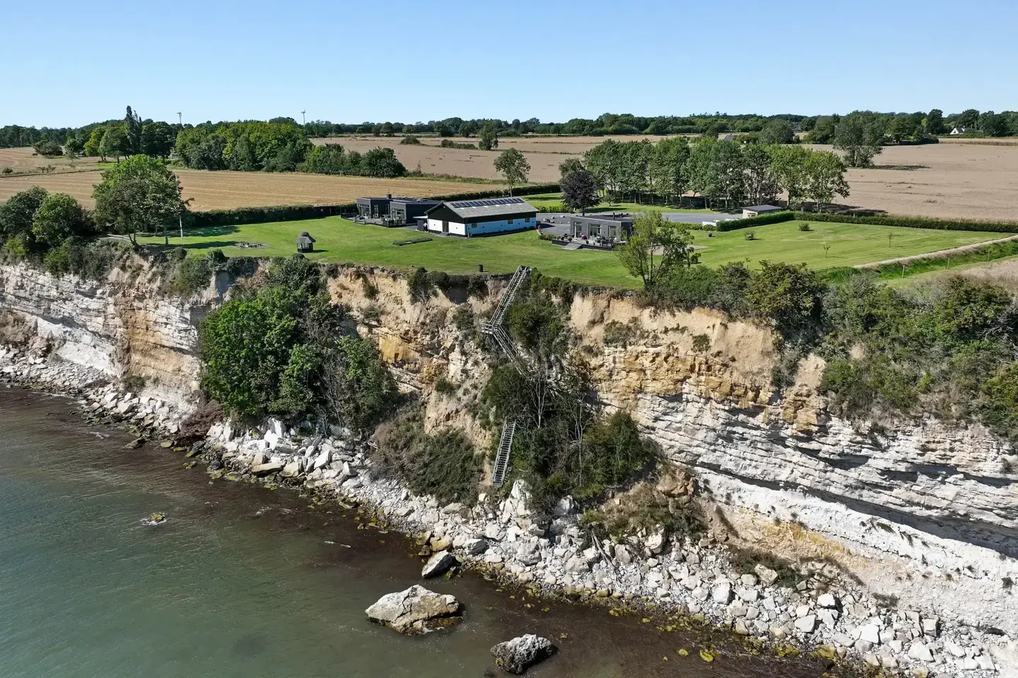 Højt hævet over Faxe Bugt, med klinten som kant og horisonten som nærmeste nabo, ligger denne enestående ejendom – et sted hvor livet leves i første række, og friheden mærkes i hjertet. 39 meter over havets overflade møder naturens stilhed arkitektonisk luksus. På næsten 6 hektar finder du to nyopførte boliger i luksusklasse med udsigt til vandet, materialer fra øverste hylde og en stor halbygning med solceller – perfekt til hestehold, værksted eller erhverv. Ejendommen har kun haft tre ejere siden 1845 og har aldrig før været udbudt til salg. Grunden breder sig som et lille stykke af noget større. Den store gårdsplads møder dig med tyngde, mens hønsehuset leverer daglige æg, og et stråtækt pavillonhus står som smukt punktum mellem blomster og flagstang. Træterrasser trækker livet ud i lyset, shelteret vender mod havet, og en privat trappe fører ned til kystens klinter. Græsarealer og åben himmel giver plads til leg, solbad og frihed. Alt praktisk er tæt på – Store Heddinge ligger 5,5 km væk, Rødvig med havn og sommerliv endnu lidt længere, og Stevns Klint med UNESCO-status ligger inden for gåafstand. Boligerne er gennemført luksuriøse med jordvarme, gulvvarme, akustiklofter og intelligente el-løsninger. Store vinduespartier lader dagslys, udsigt og himlens skiften strømme ind. Hovedboligen på 311 kvm har 63 kvm dobbeltgarage, forældresuite med sol og havbrise, walk-in og badeværelse med rainshower. Børneafdeling med to værelser og eget badeværelse skaber hverdagens ro. Den anden bolig på 83 kvm samler stue, køkken og spiseplads i åbent rum med brændeovn, panoramaudsigt og udgang til terrasse, mens soveværelset vender mod vandet med døren på klem. Et sjældent sted, hvor natur, luksus og frihed mødes i fuldkommen harmoni.