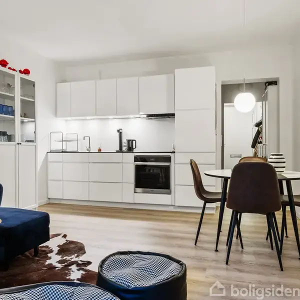 Velkommen til denne skønne 2-værelses lejlighed med en stor altan. LEJLIGHED: Der er tale om en særdeles velholdt, velindrettet og rummelig lejlighed. Boligen byder på en indbydende fordelingsentré med god plads til sko og overtøj. Det lyse køkken-alrum fungerer som lejlighedens naturlige samlingspunkt og er indrettet med et moderne, hvidt elementkøkken med mørk bordplade. Rummet har både plads til et hyggeligt spiseområde og et sofaarrangement, hvor det generøse lysindfald skaber en behagelig