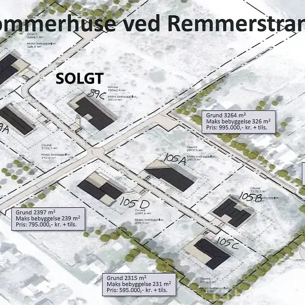 Drømmer du om at holde ferie i dit eget nyopførte sommerhus ved vandet? så er her en enestående mulighed i det naturskønne område Remmerstrand ved Nissum Bredning i Limfjorden. Remmerstrandvej 105 D er beliggende på en 2.397 m2 stor grund med udsigt til Limfjorden. Her kan bygges op til 239 m2. Byggestilen vil være et etplans sommerhus, i en max. højde på 4,5 meter, med sort træbeklædning og store åbne glasarealer evt. kombineret med andre materialer såsom beton, såfremt det kan bidrage til god facadearkitektur. Lokalplanen sikrer at der opretholdes en helhed og et samlet udtryk for området og at den lokale unikke bevoksning bevares. Grunden ligger kun et stenkast fra den børnevenlige badestrand. Husene svæver over området og er på denne måde sikret mod fremtidige klimaudfordringer - Det lettere kuperede område giver derfor mere eller mindre luft under husene. Blot 600 meter fra adressen ligger en mindre havn, med mulighed for at have båden liggende. Remmerstrand ligger med blot 15 minutters kørsel til både Lemvigs og Struers midtby og blot 4 km fra nærmeste købmand i Humlum, som også byder på flere spisesteder. Inden for den samme radius, er muligheden for at spille golf, da både Lemvig og Humlum har en golfbane. Den korte afstand til Vesterhavet holder vandet dejlig frisk at bade i, og der kan ved stranden samles østers, som kan nydes med en flaske champagne, når familie og venner er på besøg. Her er tale om et enestående og naturskønt område, der skal ses og opleves. Kontakt os på tlf.: 97851900 eller besøg os i butikken, så vi sammen kan gøre drømmen til virkelighed.