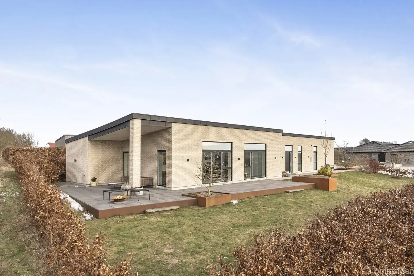 Denne lyse villa på 203 kvadratmeter fra 2021 byder på nutidig arkitektur og en gennemtænkt planløsning placeret på en 976 kvadratmeter stor grund. Boligen imponerer med sine store glaspartier, der åbner op mod den private have og terrasse, og skaber et ekstra rum i sommermånederne med masser af dagslys og udsigt til det åbne landskab og Purhøj. Det enkle, moderne ydre med lyse facadesten og fladt tag med ensidig taghældning er et stilrent valg, som matcher det minimalistiske udtryk indvendigt.