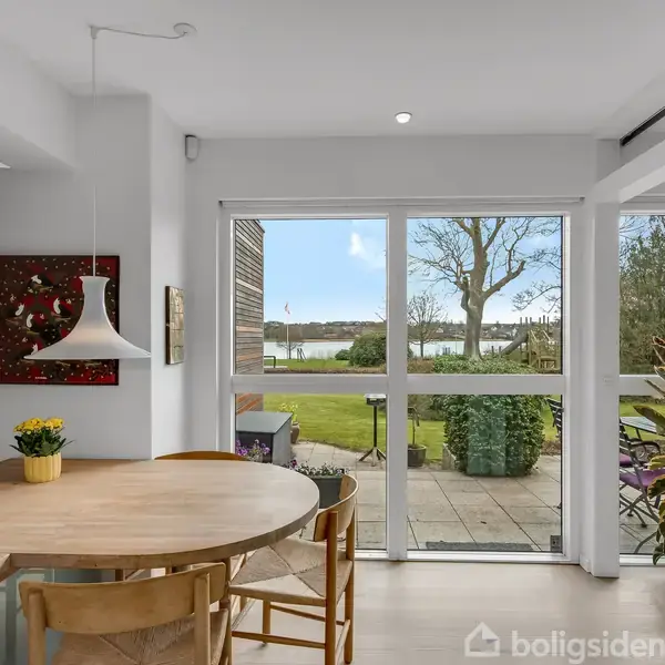 Tilbagetrukket fra Ribe Landevej fører en charmerende belægning ned til denne unikke og stilfulde villa der har fået en omfattende ombygning ved arkitekt Leif Thøgersen. Villaen er designet med fokus på lys, rummelighed og en flot udsigt til Haderslev Dam, som kan nydes fra flere af boligens vigtigste rum – herunder både stue, alrum, køkken og soveværelse samt den sydvendte terrasse. Overalt er der anvendt lyse klassiske materialer. Man bydes velkommen i en lys og rummelig hall, hvorfra der er a