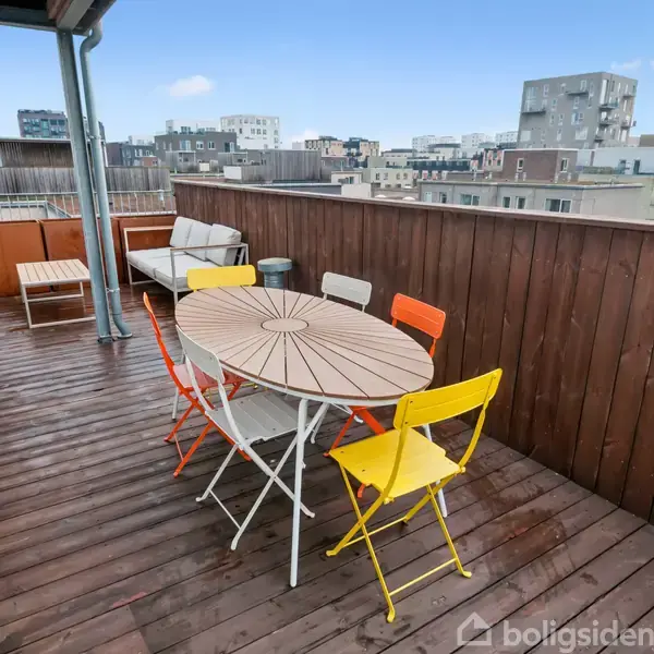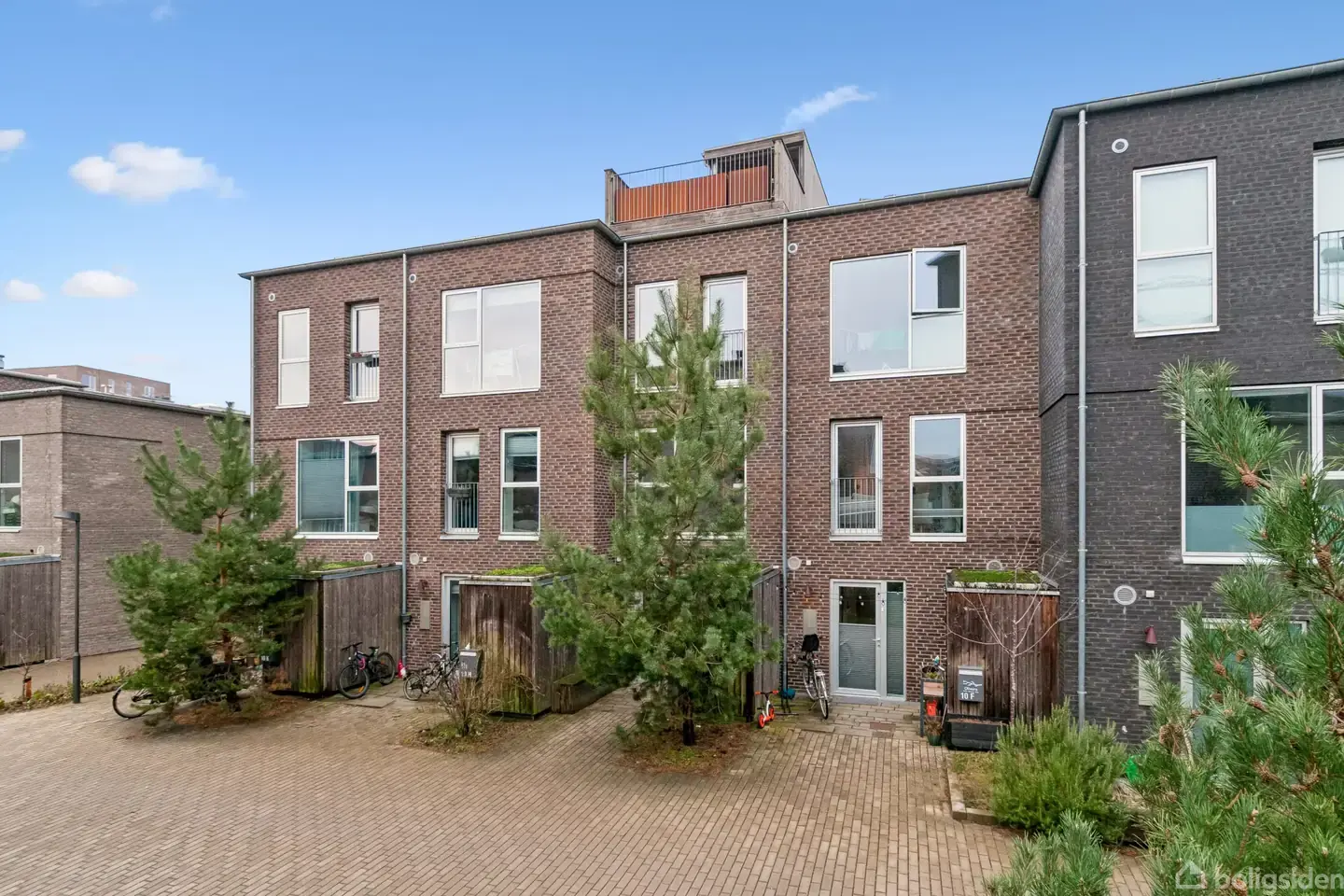 Boligen:I Ørestad Syd, hvor hverdagen glider let, og hvor Amager Fælled skaber en sjælden kontrast til bylivet, udbydes dette indbydende rækkehus i tre plan. Her bor I med alle hverdagens stop lige ved hånden, mens åbne vidder og højt til himlen bliver en naturlig del af hverdagen. Boligen fordeler 117 kvadratmeter over en gennemtænkt planløsning, der skaber en fin balance mellem fælles opholdsrum og private zoner. Øverst oppe samler tre gode værelser sig omkring et stort badeværelse med bruse