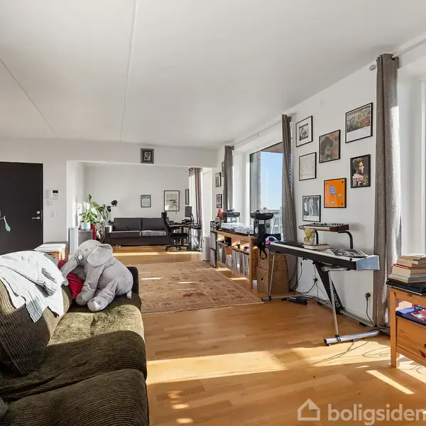 Velkommen til en lys og indbydende lejlighed i NYE. Her får du 109 m² på en attraktiv mellemetage - hvor du kommer et halvt niveau op og dermed får både bedre udsigt og solindfald.Når du træder ind i lejligheden, mødes du af et lyst og åbent opholdsrum, hvor køkken, spiseplads og stue glider naturligt sammen. De store vinduespartier i begge ender af rummet giver et flot gennemlys og en behagelig følelse af rummelighed, som straks sætter stemningen for boligen.Køkkenet fremstår stilrent med hvide
