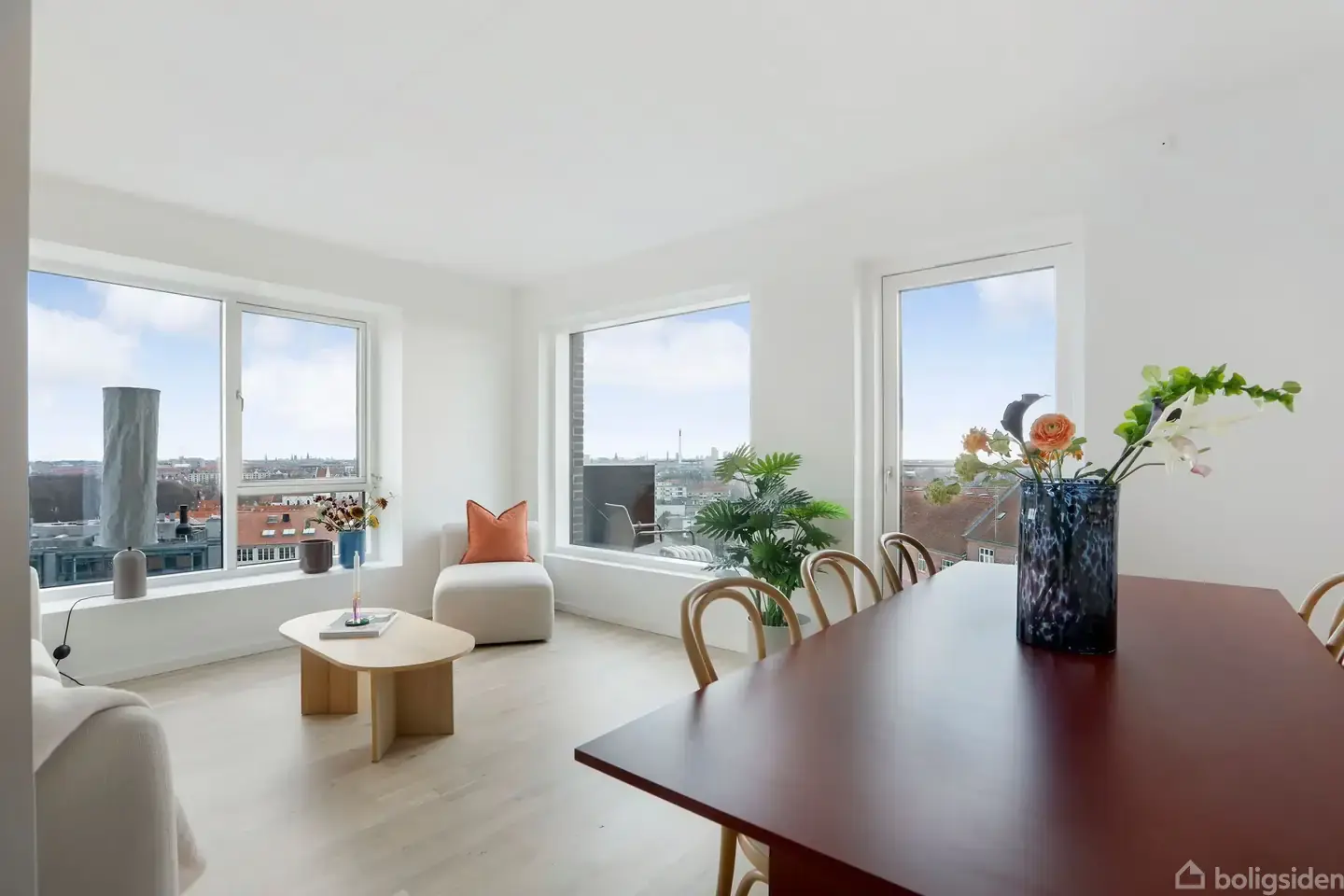Velkommen til denne lyse og rummelige 3-værelses lejlighed på 93 m², beliggende på 6. sal med panoramaudsigt over København. En moderne ejendom fra 2018, hvor kvalitet og komfort er i højsædet. Her får du en bolig, der er funktionelt indrettet og kombinerer moderne design med praktiske løsninger og ikke mindst gulvvarme overalt. Ejendommen tilbyder desuden moderne bekvemmeligheder som elevator og mulighed for leje eller køb af egen parkeringsplads. Lejligheden har et stort soveværelse med direkte adgang til et walk-in-closet/depotrum via en stilfuld skydedør, hvilket giver ekstra opbevaringsplads og et eksklusivt touch. Derudover er der et ekstra værelse, der egner sig perfekt som kontor, børneværelse eller gæsteværelse. Badeværelset er rummeligt og moderne, med separat bruseniche og vaskesøjle, hvilket giver et praktisk og rent udtryk. Lejlighedens hjerte er det store, åbne køkken/alrum, der ligger i direkte forbindelse med den ekstrem lyse stue. Det stilrene køkken er opført med hvide skabs- og køkkenmoduler, integreret opvaskemaskine og masser af opbevaringsplads. Her er der rig mulighed for at samles om madlavningen, samtidig med at der er plads til afslapning i stuen. Fra stuen er der udgang til den store sydvendte altan, hvorfra du kan nyde den friske luft og udsigten over København – et perfekt sted til afslapning eller hyggelige stunder med familie og venner. Området omkring Ringholmvej er roligt og særdeles attraktivt med sin nærhed til de grønne, rekreative områder ved Degnemosen og Bellahøj Park, hvor der er rig mulighed for gåture, løb eller en afslappende dag i naturen. Du har desuden kort afstand til lokale faciliteter såsom en god bager, dagligvarebutikker og gode busforbindelser. Grøndalscentret og Vanløse Metro kan nemt nås på cykel på få minutter, hvilket giver hurtig adgang til hele København.