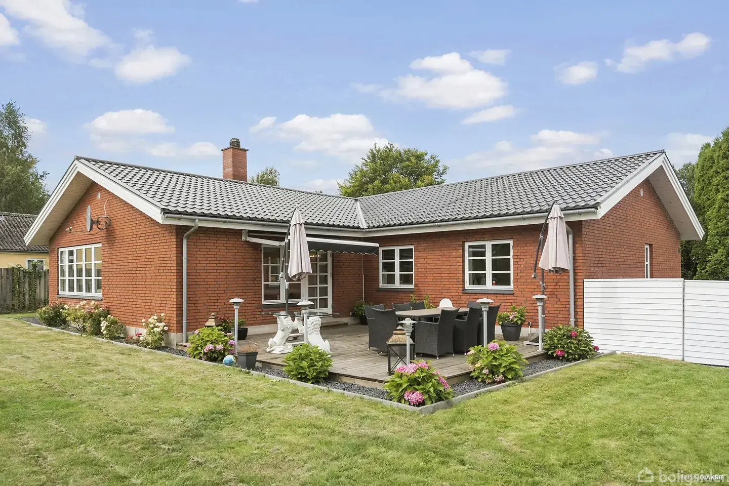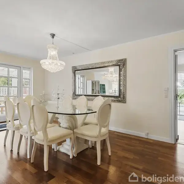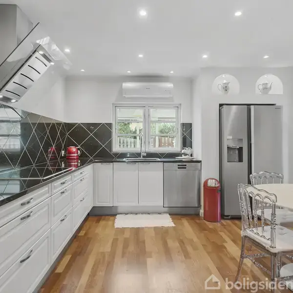 Indflytningsklar rødstensvilla med moderne komfort i klassiske rammer Velkommen til en smuk og fuldstændig indflytningsklar rødstensvilla på 170 kvadratmeter, beliggende i grønne omgivelser. Huset fremstår med klassisk charme og moderne komfort – med sin røde murstensfacade, sort tag og et indbydende, overdækket indgangsparti. Indenfor mødes man af hvide gipslofter med stuk, sprossede vinduer, fyldningsdøre og smukke trægulve, der skaber en elegant og harmonisk stemning gennem hele boligen. Ent