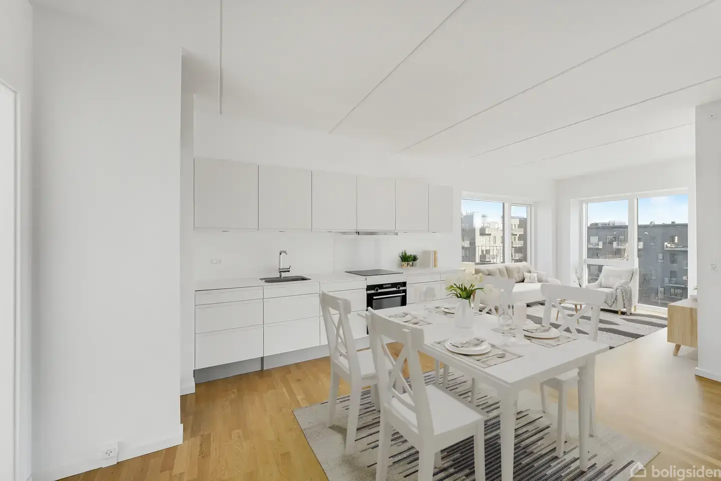 Velkommen til Robert Jacobsens Vej 38A, 4. th. – en lys, rummelig og moderne bolig, der forener byens puls med naturens ro. Denne lejlighed er det ideelle match til den store familie eller parret, der ønsker masser af plads og moderne faciliteter.Lejligheden: Lys, luft og gennemtænkte detaljerHjertet i denne store 5-værelses lejlighed er det imponerende køkken-alrum og stue, der bades i lys fra de store vinduespartier. Herfra er der direkte udgang til en af lejlighedens to altaner, som fungerer