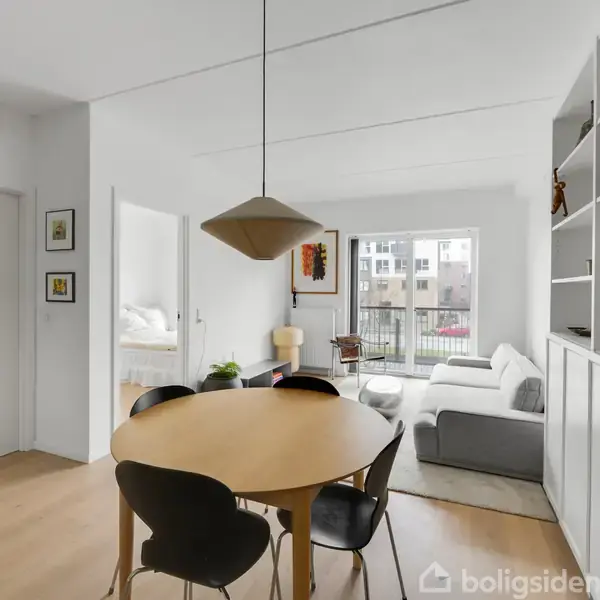 LEJLIGHEDEN På Robert Jacobsens Vej 5A venter en lejlighed med et moderne og minimalistisk udtryk – og så byder boligen også på det mest pragtfulde lysindfald. Lejligheden har store gulv-til-loft-vinduespartier, der lader sollyset strømme ind og giver udsigt hen til Royal Arena. Man træder direkte ind i entréen, der ligger i åben forbindelse med køkkenalrummet. Kvalitetskøkkenet af mærket Uno Form er lyst og minimalistisk, og de moderne skabselementer har indbyggede greb, hvilket giver et enkel