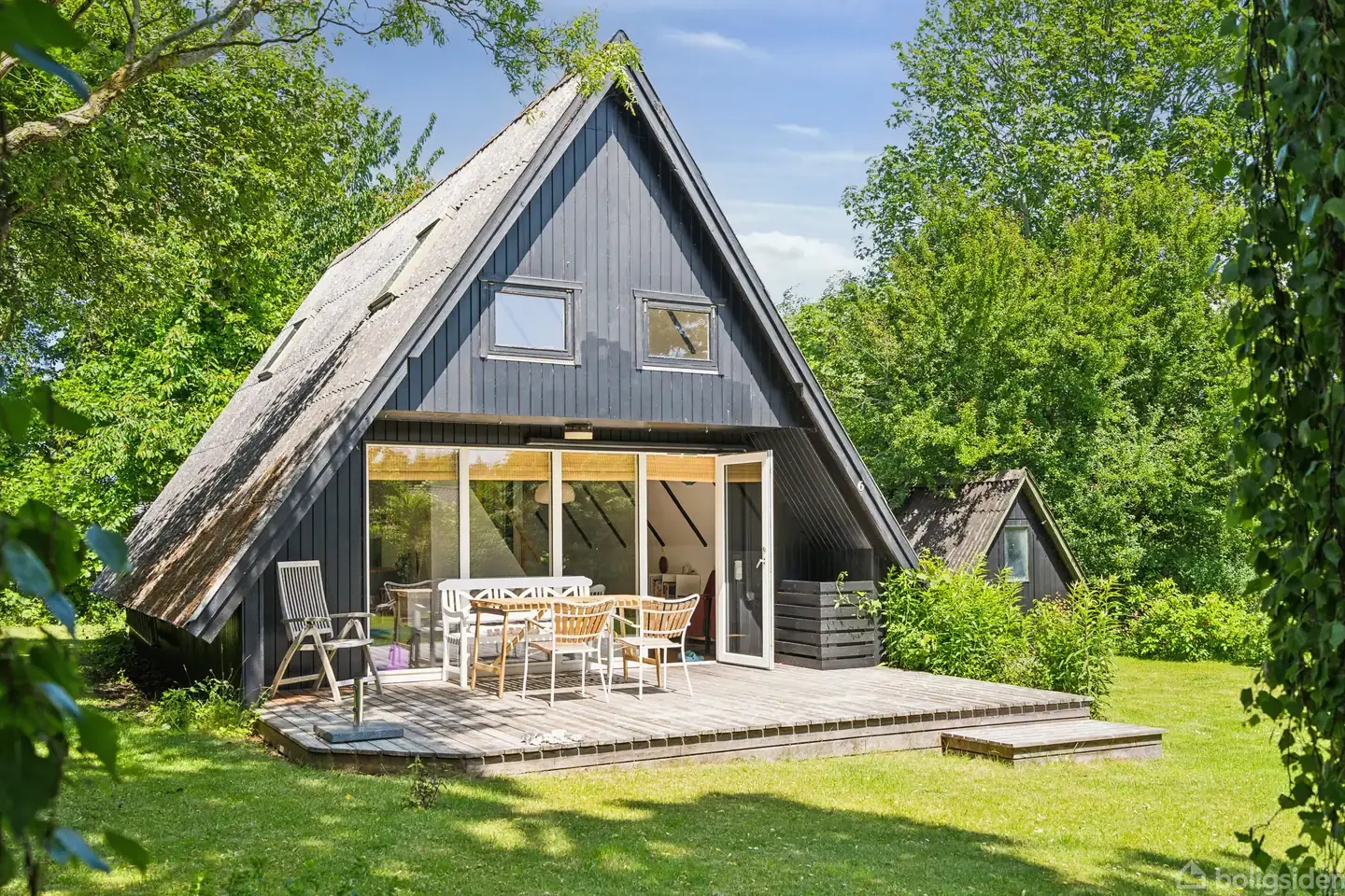 I naturskønne omgivelser nær Kongsmark Strand ligger dette stemningsfulde sommerhus. Der er tale om et velholdt A-hus fra 1976, som er spækket med charmerende detaljer og glimrende lysindfald, ligesom loftet strækker sig højt til kip. Ligeledes medfølger et udhus og en carport såvel som en fantastisk, stor og privat have med bålplads og mange andre hyggelige kroge. Sommerhuset drager først og fremmest fordel af en rolig placering tæt på marker og enge, hvor åen løber gennem landskabet. Det er o