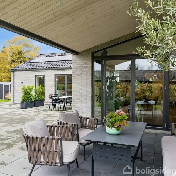 Huset imponerer fra første øjeblik med sit moderne udtryk og et velholdt ydre i lyse mursten samt tag med integrerede solceller og jordvarme, der både sikrer et lavt energiforbrug og et strømlinet formsprog. Carport med skur/værksted og cykelskur øger funktionaliteten.Gennemtænkt indretning med plads til familien Indretningen er gennemtænkt med en åben planløsning, der binder køkken, spisestue og stue sammen i ét sammenhængende opholdsrum. Her finder du et stort køkken-alrum med loft til kip, hv