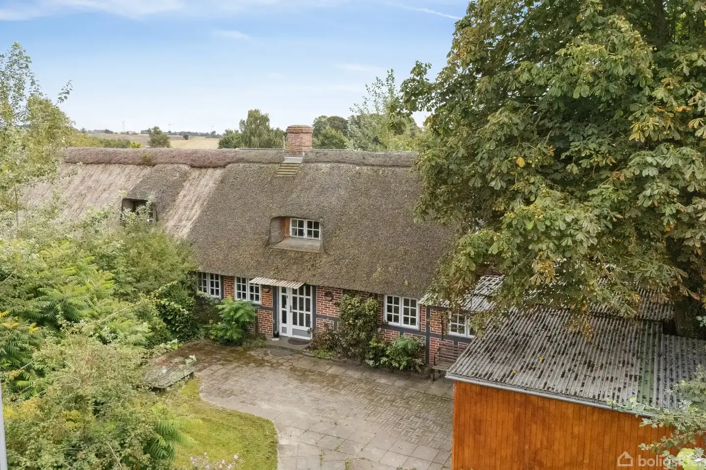 Charmerende halvt dobbelthus med privat baghaveMidt i Hadbjerg ligger der en velholdt, stråtækt bindingsværksejendom, som har prydet gadebilledet siden 1886. Ejendommen er registreret som dobbelthus, og den ene bolig står nu klar til nye ejere. Hjemmet rummer 103 veludnyttede kvadratmeter, og det byder på en rigtig god loftshøjde. Sidstnævnte kvalitet kan tilskrives ejendommens tidligere funktion som smedje – et hverv, hvor lokalerne skulle være højloftede nok til heste. I overtager et hus m