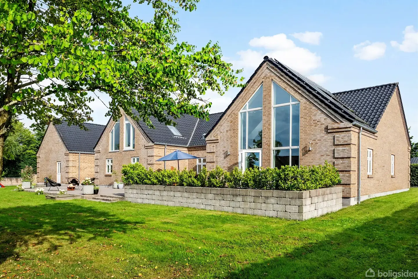 Åbent hus med tilmeldingskrav 20/2 - klik på billede - Midt i det eftertragtede Bredballe finder I denne elegante og indflytningsklare kvalitetsvilla fra 2015, opført i klassisk og tidløs stil med sort tegltag. Her får I et hjem med høj komfort og moderne tekniske løsninger – og samtidig mulighed for at kombinere bolig og hjemmeerhverv eller fordybe jer i pladskrævende hobbyprojekter i den store, isolerede garage med tilhørende værksted og gæstetoilet. Villaen er indrettet med fokus på lys, luft og funktionalitet og er i øvrigt fuldmuret. Det store køkken/alrum er boligens naturlige samlingspunkt – et fantastisk rum med imponerende loftshøjde, ovenlysvinduer med regnsensor, og et smukt køkken fra Svane med grebsfrie fronter i lys egefiner og stenbordplade. Fra alrummet er der udgang til en skøn og ugeneret terrasse, som indbyder til hyggelige sommerstunder med hele familien. Boligen rummer fire store værelser, heraf en særskilt forældreafdeling med walk-in-closet og luksuriøst badeværelse med nedsænket spa. I den modsatte ende af huset ligger de tre øvrige værelser sammen med endnu et badeværelse. Huset rummer også en hyggelig stue med hems samt et praktisk bryggers med god plads til garderobe og vaskefaciliteter. Ejendommen er teknisk veludstyret med bl.a. jordvarme, solceller, IHC-lysstyring, gulvvarme, gode akustikløsninger, Nilan-genvindingsanlæg samt klargjort centralsug og LAN i alle rum – alt sammen med fokus på lavt energiforbrug og et sundt indeklima. Garagen og værkstedet er noget helt særligt: godt isoleret og med mange anvendelsesmuligheder – hvad enten du drømmer om hjemmekontor, liberalt erhverv, værksted til biler, kreativt atelier eller blot har brug for masser af plads til din hobby. Udenfor får I en stor og privat grund med frugttræer, lukkede hyggekroge og et skønt gårdmiljø mellem bygningerne. Den sydvendte terrasse indbyder til alt fra hverdagsluksus i solen til store sammenkomster med familie og venner. Beliggenheden er helt ideel – ugeneret og børnevenlig, direkte op til stisystem med adgang til skole, pasning, indkøb og legepladser. En sjælden mulighed for jer, der ønsker moderne komfort i charmerende rammer – midt i Bredballe.