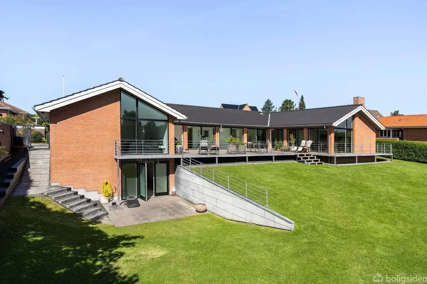 Åbent hus med tilmeldingskrav 10/2 - klik på billede - Drømmer I om en rummelig og eksklusiv bolig med plads til hele familien – i et børnevenligt område med kort afstand til alt? Så er denne imponerende villa i Dronningborg uden tvivl noget for jer. Beliggenheden er i top: Her bor I i et trygt og attraktivt kvarter med kort afstand til både skole, børnehave, vuggestue og gode indkøbsmuligheder – og samtidig kun få minutters kørsel fra Randers C. Boligen er opført med fokus på både æstetik og funktionalitet og byder på hele pakken til den moderne, pladskrævende børnefamilie. Allerede når man træder ind i den lyse og indbydende entré, fornemmer man husets gennemførte stil. Herfra har man kig gennem den store stue og direkte ud mod terrassen og den storslåede udsigt – en stemning af luft og lys, der præger hele hjemmet. Husets hjerte er det imponerende køkken/alrum – et skønt samlingspunkt med store vinduespartier, loft til kip og et smagfuldt, hvidt køkken med masser af skabsplads. Her er rigelig plads til det store spisebord, hvor venner og familie kan samles til hyggelige middage og fester. I åben forbindelse ligger stuen – hyggelig og indbydende med brændeovn, store vinduer og udgang til den store, lækre træterrasse. Herfra kan I nyde udsigten og gå direkte ned i den grønne og nemt holdte have, som er perfekt til leg, boldspil og afslapning i solen. Boligen rummer hele tre gode børneværelser samt et stort soveværelse med eget walk-in closet og adgang til luksuriøst badeværelse med badekar. Derudover får I endnu et flot badeværelse samt et praktisk bryggers med både vaskefaciliteter og god opbevaringsplads. Til huset hører desuden en integreret garage med to el-porte og yderligere opbevaringsmuligheder, samt et værksted under boligen – ideelt til havemøbler, redskaber eller hobbyprojekter. Her får I en bolig i absolut særklasse – med masser af plads, moderne komfort og en fantastisk beliggenhed for familien, der ønsker både luksus og nærhed til hverdagens fornødenheder.