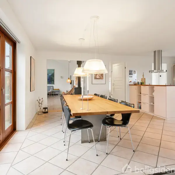 Beliggenheden på Rosenholmvej 94 i Tjørring er karakteriseret ved et roligt og familievenligt miljø, hvor stisystemer, grønne omgivelser og nærhed til skole, daginstitutioner og indkøb præger området. Her opleves en tryg atmosfære med fokus på hverdagens behov. Villaen, der er fuldmuret, fremstår med klassisk murstensfacade og betontagsten, og det tidløse arkitektoniske udtryk underbygges af gennemførte materialevalg, der har lang holdbarhed. Den brede indkørsel fører til en rummelig garage, som