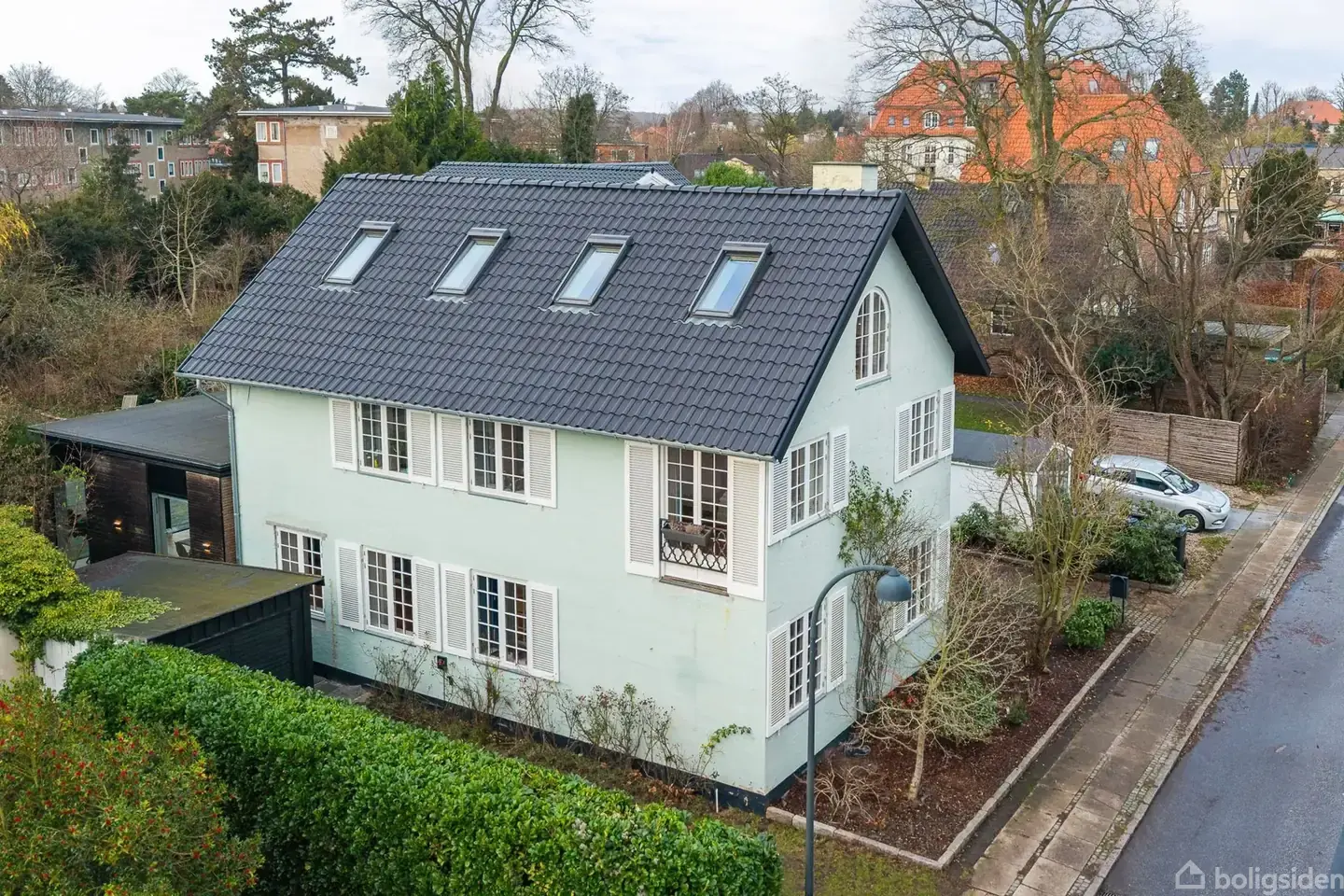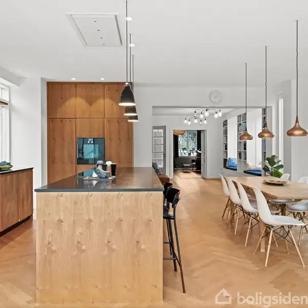 Den pastelgrønne facade, de karakteristiske skodder og det arkitektoniske udtryk signalerer allerede ved ankomsten, at her er tale om noget helt særligt. Boligen rummer 268 veludnyttede boligkvadratmeter, hvor klassisk arkitektur og nutidig æstetik mødes i en gennemført helhed. Indretningen er personlig og stilsikker –– og skaber en følelse af både ro, kreativitet og frihed. Huset har fået en utrolig spændende tilbygning, som er udført med stor respekt for dets oprindelse og fremstår som et moderne modspil til den oprindelige villa. Resultatet er et imponerende køkken-alrum med højt til loftet, hvor et markant gulv-til-loft-vinduesparti med skydedøre forbinder rummet direkte med den sydvestvendte terrasse og haven. Overgangen mellem inde og ude opleves næsten flydende, og året rundt kan man følge årstidernes skiften med udsigt til den ugenerede have og den store smukke gamle hængepil. Der er ingen tvivl om, at køkken-alrummet er et naturligt samlingspunkt i hverdagen og husets hjerte. Gennemførte rum med sammenhæng. Man bydes indenfor i hallen med et smukt trappeløb, der er åbent hele vejen til huset 2. sal, en meget fin detalje af mange i huset. Fra hallen træder man ind i en stor mellem stue med indbyggede reoler langs hele den ene væg, med masser af plads til både bøger og kunst. Her er integrerede siddepladser og rigelig opbevaring i de mange skuffer, og rummet fungerer samtidig ideelt som legeområde. Fløjdørspartier åbner ind til den skønne tv-/pejsestue, hvor der er god plads til flere sofagrupper, også foran pejsen som har fået praktisk stålindsats med glaslåge. I stueplan finder man også et praktisk bryggers (grovkøkken) samt et moderne gæstetoilet. 1. sal er ligeledes meget imponerende med et lyst, indbydende udtryk og god loftshøjde. Et dejligt åbent fællesrum forbinder de tre gode værelser på etagen. Ét af værelserne har fransk altan og et smukt vinduesparti med udsigt til de øvrige villaer på vejen. Her findes desuden et stort og indbydende badeværelse i moderne stil med både badekar, bruseniche og dobbeltvask. 2. salen er naturligvis i samme høje standart, indrettet med 2 rigtig gode værelser og endnu et lækkert badeværelse i samme gennemførte stil. Her er loft til kip og meget finde detaljer omkring vinduerne. Kælderen er funktionel og velindrettet med depotplads, to disponible rum og vinopbevaring. Garage og praktisk skur og gårdmiljø der matcher huset, her er også en mulighed for at lave et helt særligt udekøkken. Renoveringen i 2019 omfattede gennemgående sildebensparket, gulvvarme på alle tre etager, nye toiletter og badeværelser med Vola-armaturer samt nye Bøjsø-vinduer. Huset er isoleret hele vejen rundt og har fået nyt tag, og energistandarden er tilsvarende høj. Samtidig er der opført en markant 50 m² tilbygning i et moderne design med køkken fra Handcrafted Interiors og imponerende gulv-til-loft-skydedøre, der åbner elegant mod den vestvendte terrasse og haven. Et sjældent hjem, hvor arkitektur, mod og funktionalitet er tænkt sammen – og hvor både inde- og udeliv opleves som en helstøbt helhed. Mange tak fordi du kiggede på ét af vores boligemner. Har du behov for yderligere oplysninger, eller ønsker I at blive skrevet op i vores effektive køberkartotek, er du altid velkommen til at kontakte os. Overvejer du et salg af din bolig, præsenterer vi med glæde en salgsvurdering, hvor vi omhyggeligt har vurderet din nuværende bolig – med personligt engagement og tilbud om solgt eller gratis. Naturligvis helt uforpligtende. Kontakt os venligst på 3961 6162 eller [email protected]