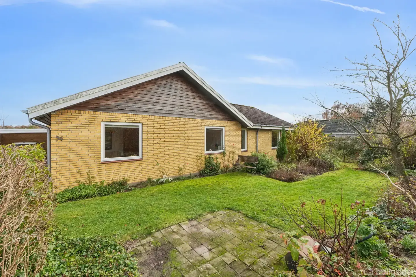 Velindrettet etplansvilla med god beliggenhed i BellingePlaceret i skønne omgivelser for enden af et lukket vænge finder I denne fine og velindrettede etplansvilla, som nu kan blive jeres næste hjem. Ejendommen præsenterer sig pænt med sin gule murstensfacade, der smukt komplementeres af hvide vinduesrammer og døre. Indenfor venter jer 157 m² med en veldisponeret planløsning, der rummer et køkken, en stue, fem værelser, to badeværelser og et bryggers. Udenfor kan I se frem til en hyggelig og vel