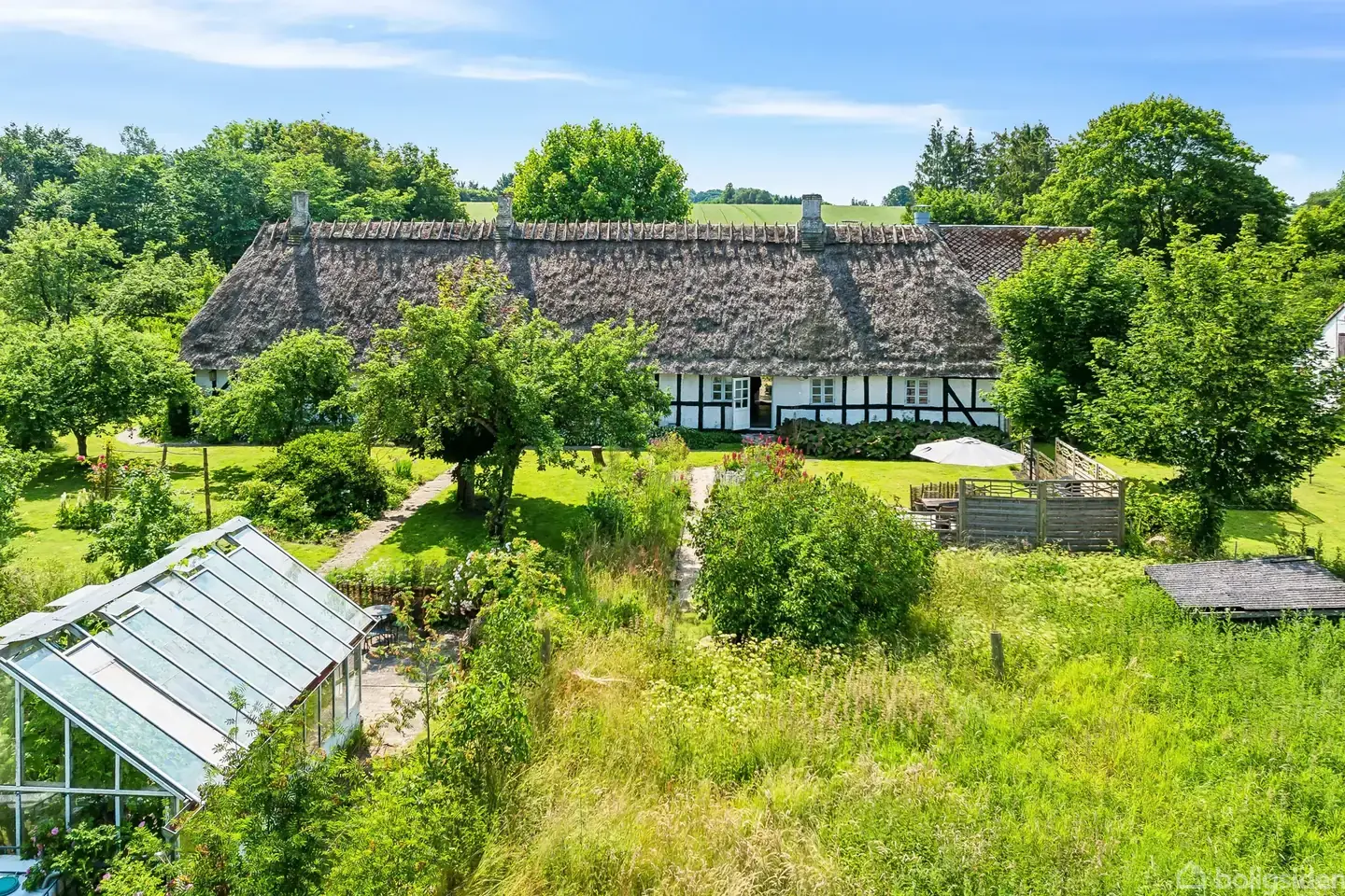 Det er som at være med i en fortælling om gamle dage her på Sandagervej 2 lidt uden for Gislev på Midtfyn. Den gamle oldermandsgård er helt tilbage fra 1750 og står helt som den skal med bindingsværk, stråtag og småsprossede vinduer. Hertil kommer flere tidligere landsbrugsbygninger, der giver ekstra plads og muligheder og ikke mindst den fantastiske have med en næsten overdådig frodighed, et væld af frugttræer, drivhus, store plæner og flere terrasser. Velkommen til!Både inde og ude er stuehuse