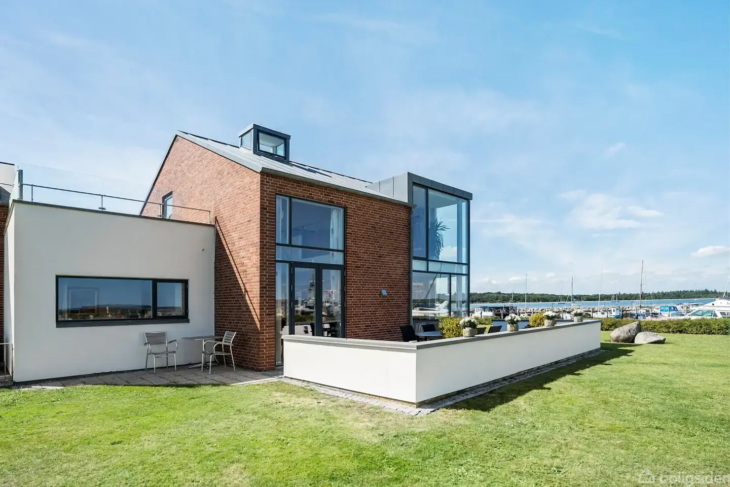 Åbent hus med tilmeldingskrav 2/2 - klik på billede - Med frit skue til morgenbaderne, Liniepavillonen, kyststrækningen og havnen i Juelsminde by, finder du dette smukke og moderne ”Færgehus” fra 2004. En hel unik boligmasse som karakteriseres af kvalitetsmaterialer, fokus på udsigt og ikke mindst det gode og trygge naboskab. Her får du virkelig lov at nyde tilværelsen. Boligerne på den gamle færgehavn er opført i samme stil og fremtræder derfor elegant og stilrent i bybilledet, og selvom naboen ikke er langt væk, vil du ikke komme til at gå på kompromis med privatlivet. Fra boligen har du hele Juelsminde i gåafstand og naturen kan virkelig nydes i sit fulde drag. Ved køb af Sandbjerg Strandvej 10, erhverver du også retten til en bådplads i Sandbjerg Marina uden indskud. Dvs. at du kun skal betale havnebidrag og medlemsskab til Juelsminde Sejlklub. Boligen rummer i alt 178 m² fordelt på 2 plan og med tilhørende garage. Her får du en bolig, der fremstår lys og indbydende med hvide akustik lofter, ege parketgulve og Emeral Pearl granit gulve i køkken og på badeværelset i stueetagen. Der er gulvvarme overalt i hele boligen, og et skønt lysindfald fra de store panoramavinduer, der vender mod vandet. De grønne arealer omkring boligen vedligeholdes af grundejerforeningen og du skal derfor ikke bekymre dig om græsklipning og lugen i bedene. Du vil blive budt varmt velkommen i den flotte entré, med et fantastisk lysindfald og et blåt skimt i horisonten gennem de store vinduespartier. Her vil du opleve indsejlingen til Juelsminde Havn, hvor masterne kan betragtes i det fjerne. Et ganske unikt syn fra sin hoveddør. Stueplan indeholder desuden et elegant køkken og en dejlig stor stue med plads til det lange plankebord, når gæsterne kommer på besøg. Her finder du også et lyst og lækkert badeværelse og et værelse. Bilen, båden eller andet legetøj kan parkeres i den rummelige garage. Herfra træder du ind i husets praktiske bryggers med vaskefaciliteter og plads til overtøj i entren. På førstesalen er der adgang til en rummelig og lys stue med udsigt over vandet og havnen samt udgang til en dejlig altan, hvor udsigten og solens varme stråler kan nydes. Endvidere er der adgang til et rummeligt soveværelse med eget tilhørende badeværelse. En virkelig skøn villa med en helt særlig beliggenhed i skønne Juelsminde by.
