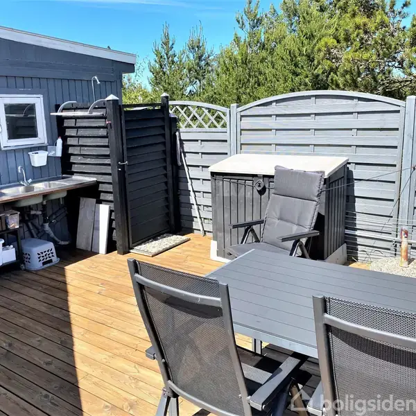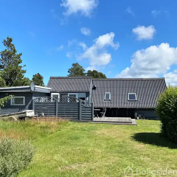 Velbeliggende gråmalet fritidshus på 71 kvm. hvortil kommer 10 kvm. udhus og overdækket redskabsrum. Beliggende på en 1253 kvm. stor naturgrund med nogen beplantning og med gode terrasser mod såvel øst, syd som vest hvor udelivet kan nydes. Kun 2-300 meter til 1'ste klasses badestrand og kort afstand til klitplantage, 18 hullers golfbane og motorvejsforbindelse mod Hjørring, Ålborg og Århus. Fritidshuset, der oprindelig er opført i 1965 men om- og tilbygget senest i 2016, har sort eternittag, plast-termovinduer, træ- og klinkegulve, opvarmes ved el-varme og luft til luft varmeblæser og er tilsluttet offentlig kloak. Indeholder: køkken i åben forbindelse til opholdsstue med loft til kip og dobbeltdør til sydvendt terrasse, soverum med seng, faste skabe og adgang til lille gæstebadeværelse med bruseniche, mellemværelse med sovesofa, soveværelse med faste skabe, badeværelse med bruseniche og klinkegulv, spisestue med klinkegulv, gulvvarme, loft til kip og store glaspartier med dobbeltdør til vest-terrasse og udgang til indhegnet øst-terrasse med udebruser og udekøkken.
