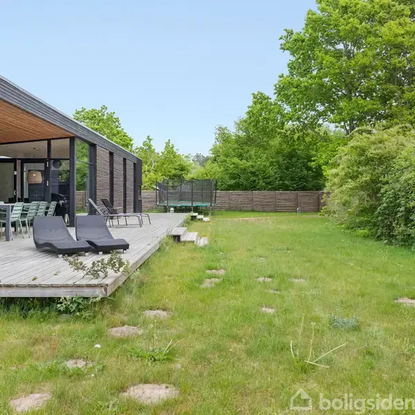 Midt i det smilende, sommerlige Danmark laa det som et barsk Sibirien. Dette var Stedet. Denne Høj stod i mystisk Pagt med mit Sind,” sagde billedhuggeren Rudolf Tegner i 1916, da han cyklede rundt sammen med sin hustru i Hornbæk. Han købte 34 tønder land, døbte det Rusland og byggede et museum til egne værker. For 100 år siden var Hornbæk en magnet for kunstnere. I dag er Hornbæk en af de mest attraktive sommerhusbyer på Nordkysten. Lige om hjørnet fra sommerhuset på Saronvej ligger det enebærvoksende og lyngklædte hede- og naturområde til Tegners Museum i Rusland. Det er et stort sommerhus på 130 m2. Det er så nyt som fra 2020, altså ikke meget vedligeholdelse de næste mange år. Pivlækkert og tiptopmoderne er det med alt hvad et 2025-hjerte kan ønske sig. Kom i lange weekender, i korte og lange ferier, kom hele året. Det er bygget til det. På den syd- og vestvendte terrasse er der sol på maver og bare isser hele dagen. Solcreme og kasket med skygge kan anbefales. Grunden er på 1.340 m2 med en have, der slet ikke har noget imod at være vild med vilje. Hornbæk er ikke en by, der sover tornerosesøvn hele vinteren. Her bor næsten 4.000 faste menneskesjæle, og med bare 40 minutter fra København kommer sommerhusejerne hele året. Her er vinterliv, alt er åbent. Lyset har altid været noget særligt i Hornbæk, derfor kaldes den også for lysets by og den Nordsjællandske Riviera. Solnedgangen langt ude i Kattegat har altid tilskuere med et glas vin på stranden. 10 cykelminutter fra sommerhuset på Saronvej, så er man på en af de bedste sand- og badestrande på Sjælland.