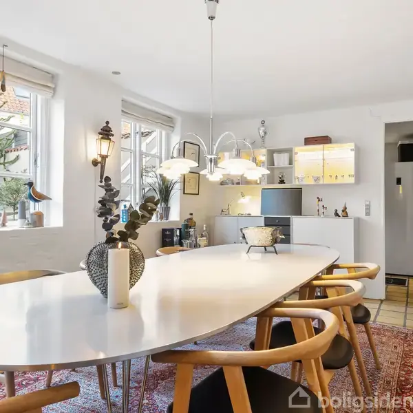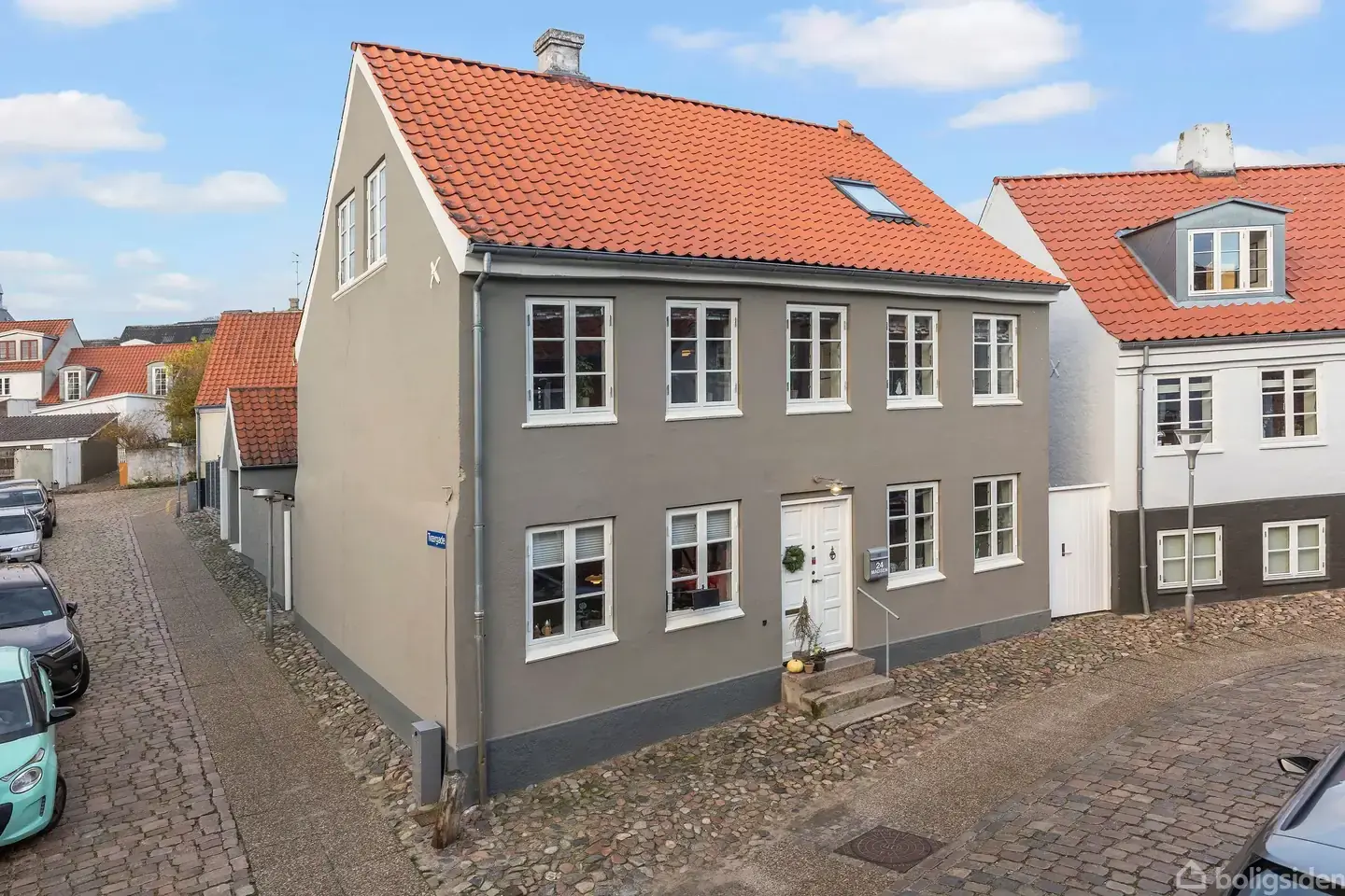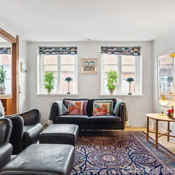I det eftertragtede Schousgade-kvarter, hvor brostensbelagte gader og velbevarede byhuse skaber en helt særlig atmosfære, ligger dette enestående byhus. Ejendommen er opført i 1840 og nænsomt ombygget i 1983, så den i dag kombinerer historisk sjæl med moderne komfort – kun to minutters gang fra Rådhuspladsen. Boligen rummer 208 m² fordelt på tre plan og tilbyder en fleksibel indretning med god plads til både familie, gæster og hjemmearbejde. Hertil kommer en af kvarterets sjældne store gårdhaver samt en garage med elport og direkte adgang til uderummet – en usædvanlig og eftertragtet løsning i den centrale bydel. Allerede i entréen møder du hjemmets varme og karakter. Her står de synlige bjælker smukt sammen med de rustikke indvendige murstensvægge og giver boligen en helt særlig autenticitet. Stueplanet byder på et lyst køkken med hvide elementer og spiseplads i åben forbindelse med et skønt alrum med sprossede vinduer og udsigt til gårdhaven. Et værelse, et badeværelse med bruseniche samt et praktisk bryggers med adgang til uderummet fuldender etagen. Overalt er der de klassiske gule klinker, og i både køkken og alrum er der gulvvarme. På 1. salen ligger to dejlige stuer, hvoraf den ene har brændeovn. Herfra er der kig til både gaden og den hyggelige gårdhave. Etagen rummer desuden to værelser – det ene med udgang til en charmerende altan. 2. salen består af et badeværelse med bruseniche, et soveværelse og endnu et værelse, som kan anvendes efter behov. De tre plan giver en sjælden fleksibilitet, uanset familiestørrelse eller indretningsønsker. Gårdhaven er et særligt højdepunkt. Den er usædvanligt rummelig for området og indrettet med flisebelagte terrasser, hvor der både er plads til spisebord, grill og loungemiljø. Her får du et privat, solrigt uderum midt i byen – den perfekte balance mellem byliv og fredelige omgivelser. Kvarterets ejerlaug bidrager til et godt fællesskab, og her er mulighed for at leje det hyggelige fælleshus. Schousgade 24 er et byhus med sjæl, historie og unikke rammer – et sted hvor hverdagen leves i smukke, autentiske omgivelser midt i byens pulserende centrum.